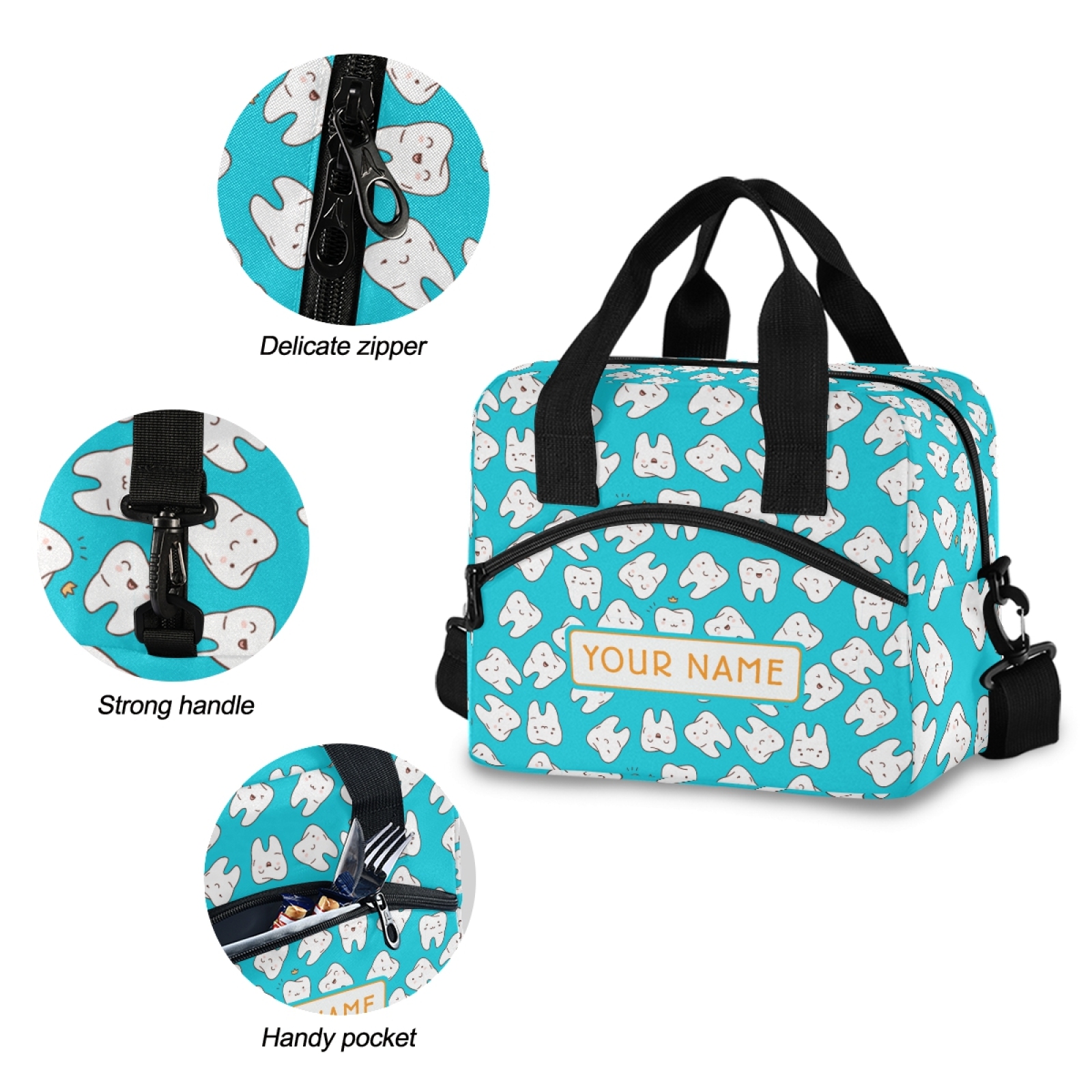 DURABLE: Decorated with permanent, eco-friendly fabric printing, permanently dyed into the fibers, that will not fade, crack or bleed and lasts permanently, even with repeated use and cleanings, withstanding the normal wear and tear of a lunch bag.