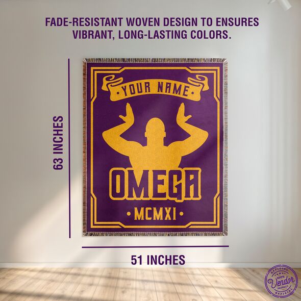 This Omega Psi Phi tapestry is crafted with precision and attention to detail, reflecting the fraternity's legacy. Featuring a jacquard woven design, it combines style, durability, and meaningful representation. Measuring 51 x 63 inches, the tapestry is ideal as a decorative piece for dorm rooms, living spaces, or sofas, offering a touch of elegance and fraternity pride. This item can also be personalized with custom text, making it a meaningful and one-of-a-kind keepsake.BENEFITS
