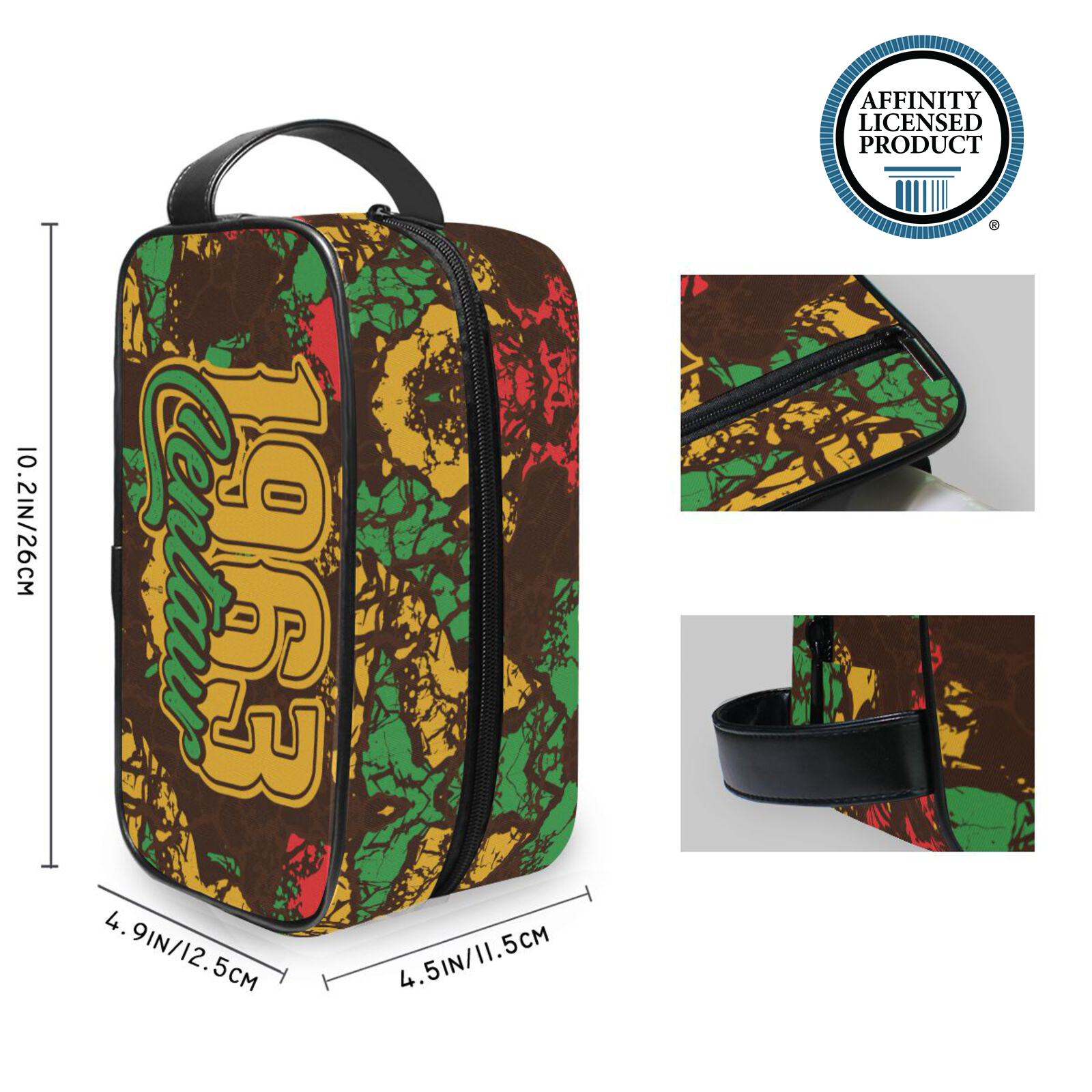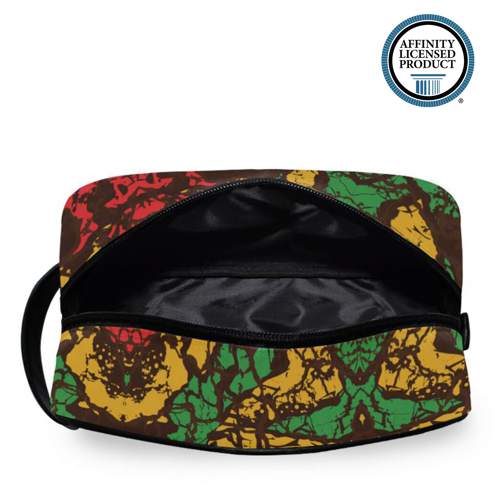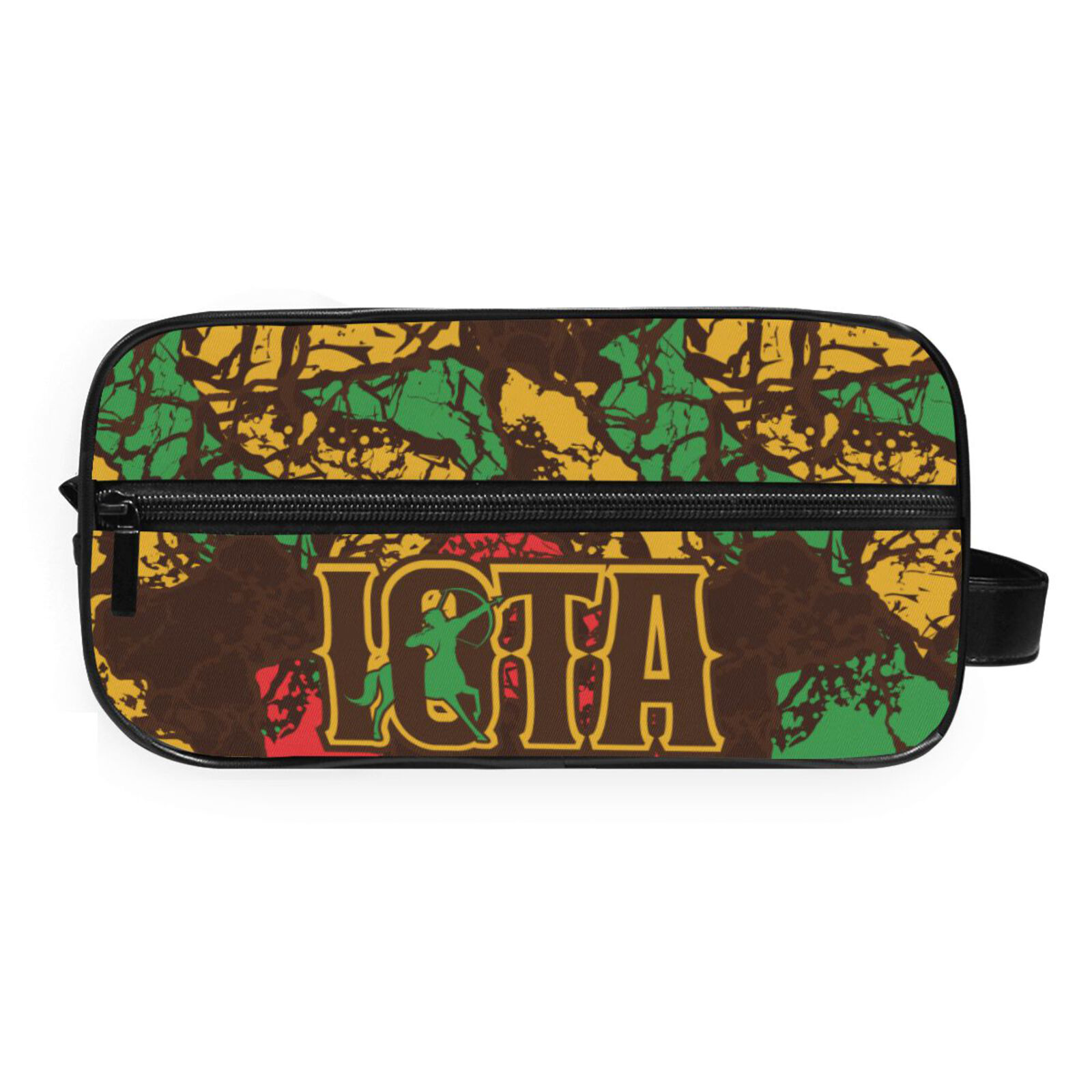 Decorated with permanent, eco-friendly fabric printing, permanently dyed into the fibers, that will not fade, crack or bleed and lasts permanently, even with repeated use and cleanings, withstanding the normal wear and tear of a travel toiletry pouch.