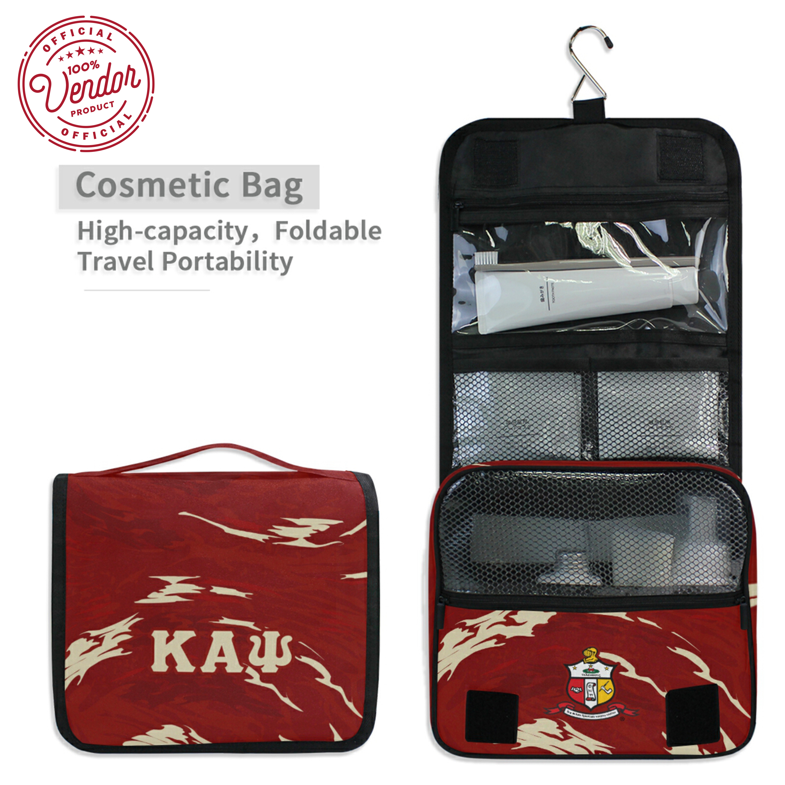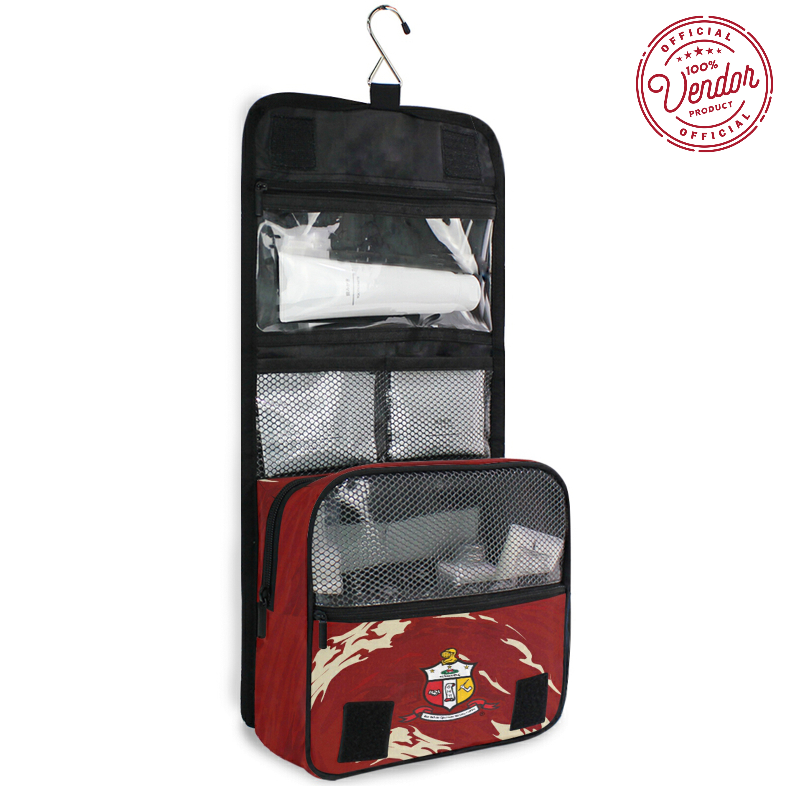 This Kappa Alpha Psi hanging toiletry bag is a functional and stylish way to stay organized while representing your fraternity. Designed for members of Kappa Alpha Psi Fraternity, it features a permanently printed design that resists fading, cracking, or peeling, even with regular use. The spacious interior includes multiple compartments and pockets, allowing you to store grooming essentials in an organized and accessible way.