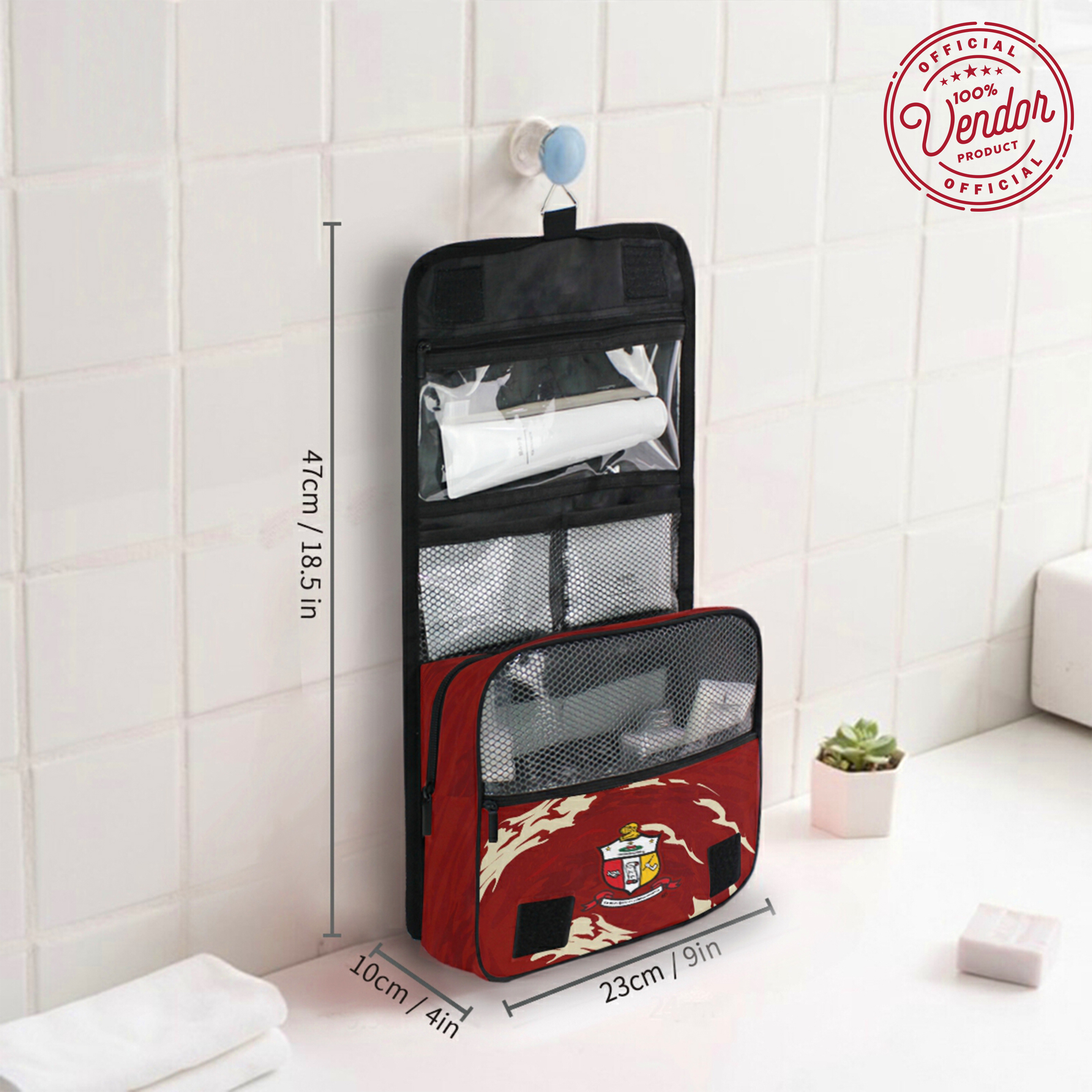 Measuring 9 x 4 x 18.5 inches, this Kappa Alpha Psi fraternity bag is ideal for travel, offering plenty of room without taking up too much space. The hanging hook allows for easy access in hotel bathrooms or shared spaces. Whether you're shopping for yourself or searching for Kappa Alpha Psi gifts, this toiletry bag is a practical option that combines function and fraternity pride.