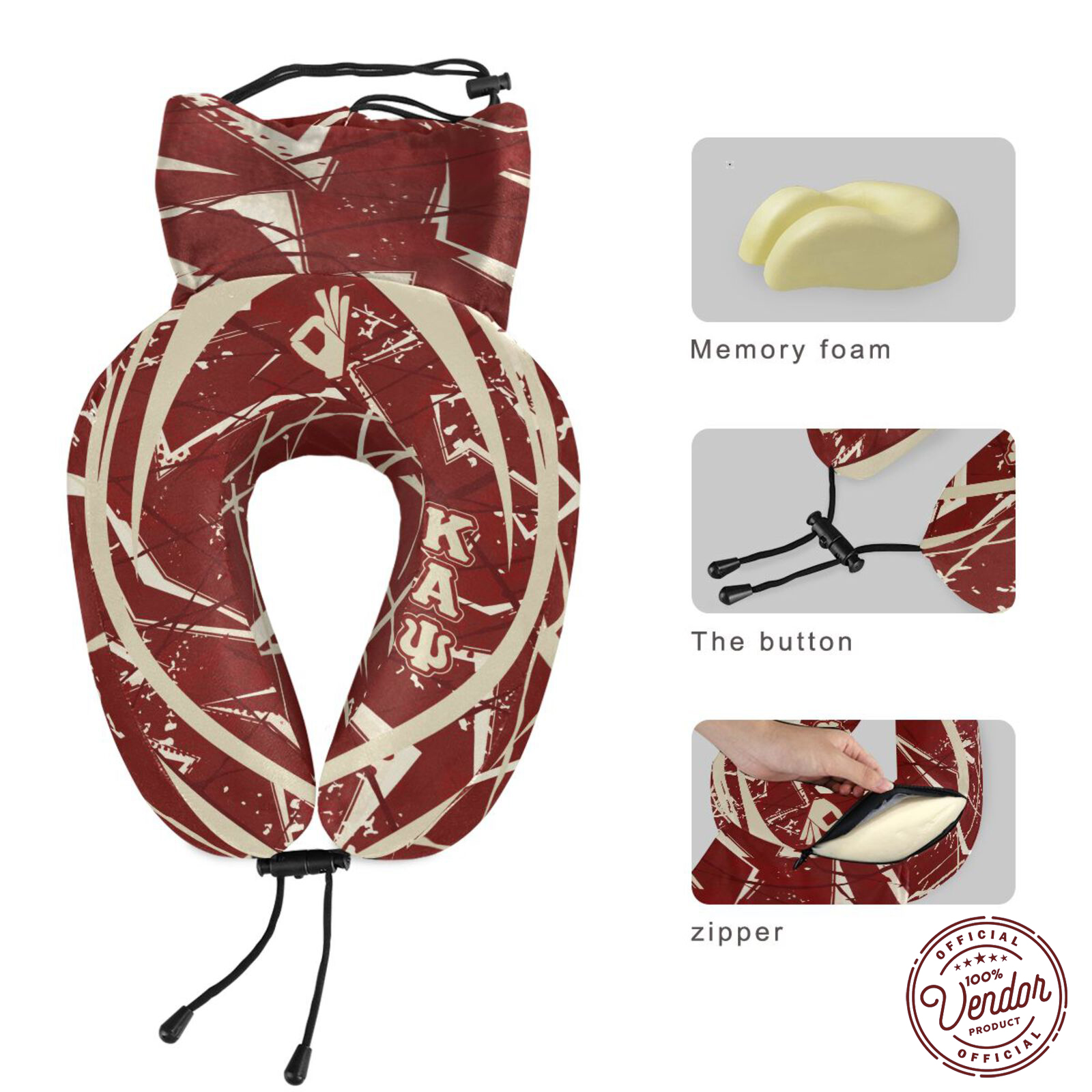 The materials used for the travel pillow have been meticulously selected for quality and attention to detail. Crafted from soft velvet fabric, it's not only pleasing to the touch but also exceptionally comfortable to use. Adorned with Kappa Alpha Psi fraternity's distinguished colors of crimson and cream, it discreetly showcases your fraternity pride. You can trust that this neck pillow is easy to clean and durable, thanks to its sturdy zipper and pillow cover fabric.