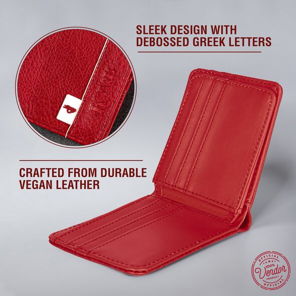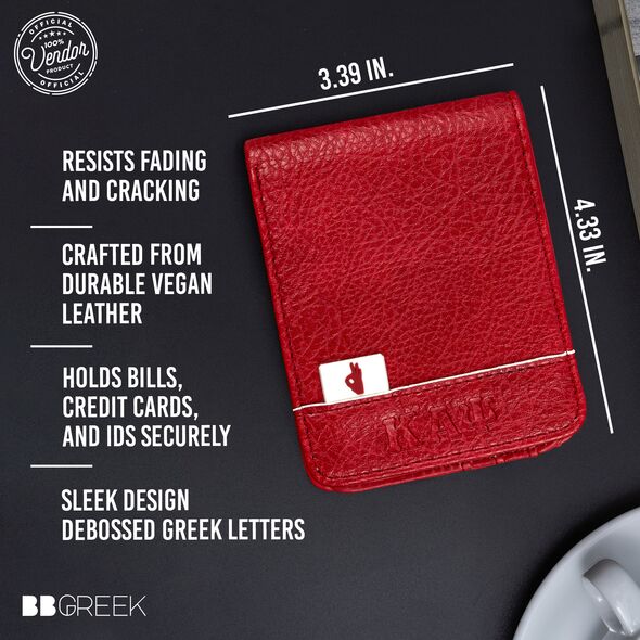 This compact wallet is crafted with high quality leather, combining style, durability, and functionality. Featuring the iconic Kappa Alpha Psi Greek letters debossed and a silicone patch in official colors, the wallet reflects fraternity pride while offering eco-friendly construction. With protective coatings and thoughtful craftsmanship, it resists fading, cracking, and moisture, ensuring long-lasting performance.