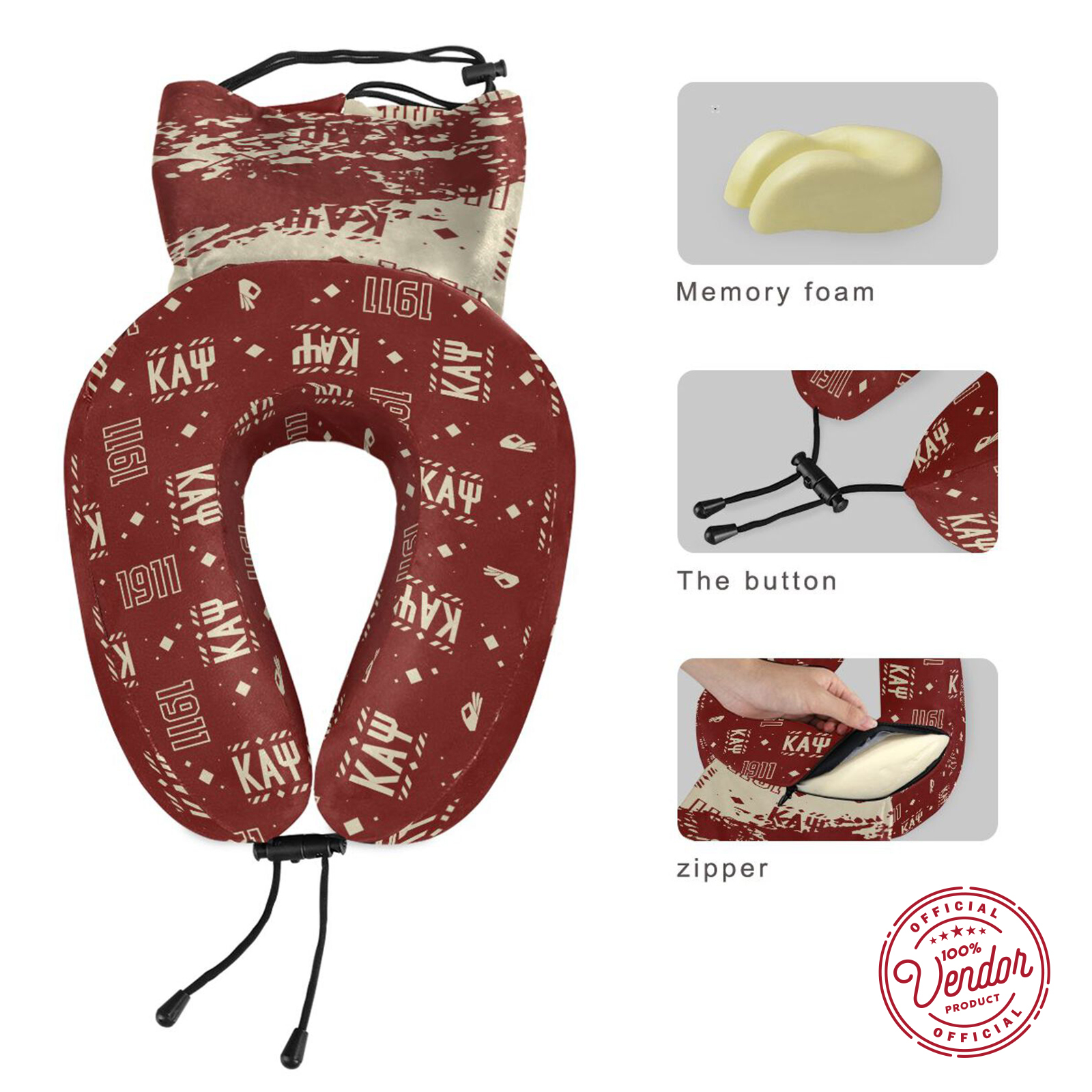 The materials used for the travel pillow have been meticulously selected for quality and attention to detail. Crafted from soft velvet fabric, it's not only pleasing to the touch but also exceptionally comfortable to use. Adorned with Kappa Alpha Psi fraternity's distinguished colors of crimson and cream, it discreetly showcases your fraternity pride. You can trust that this neck pillow is easy to clean and durable, thanks to its sturdy zipper and pillow cover fabric.