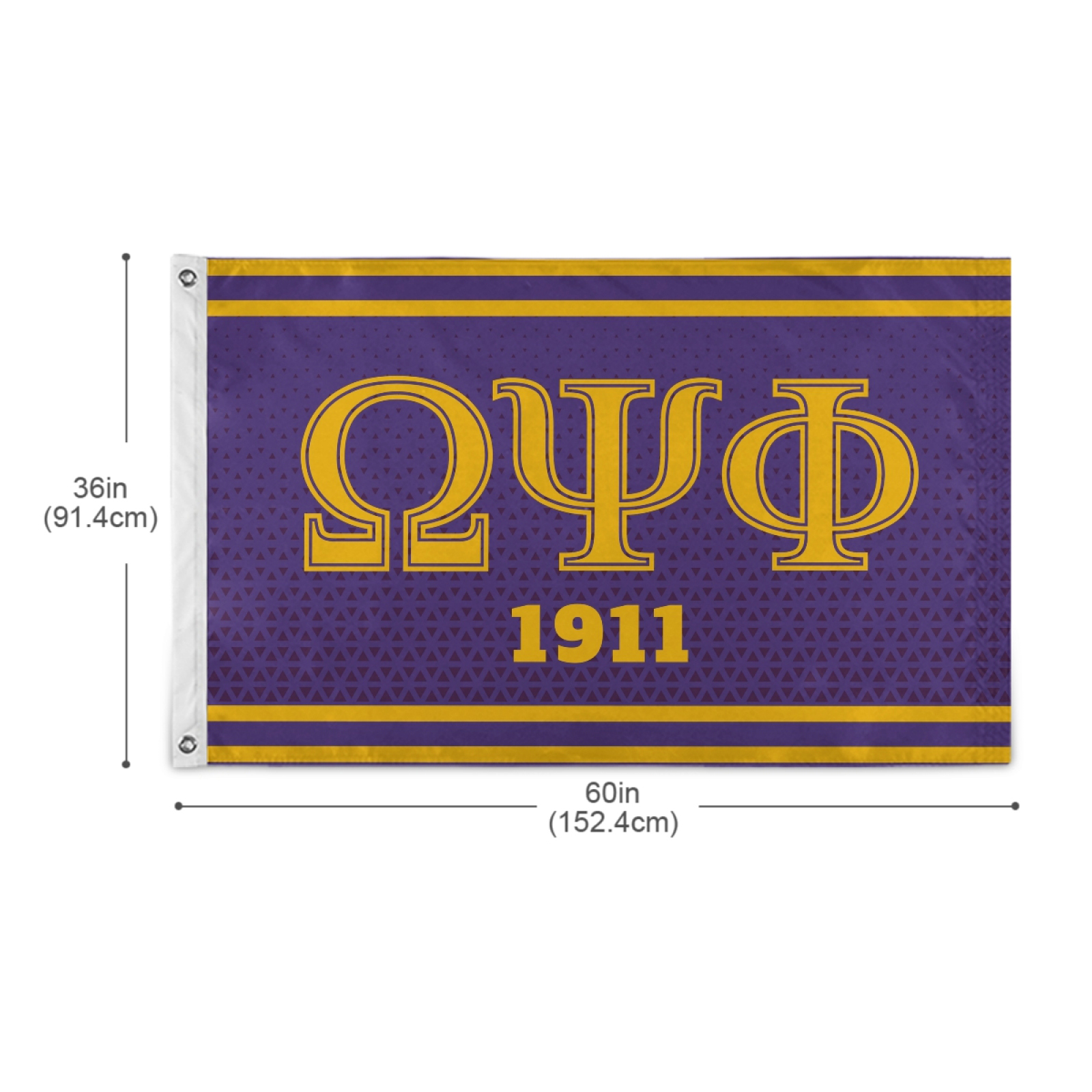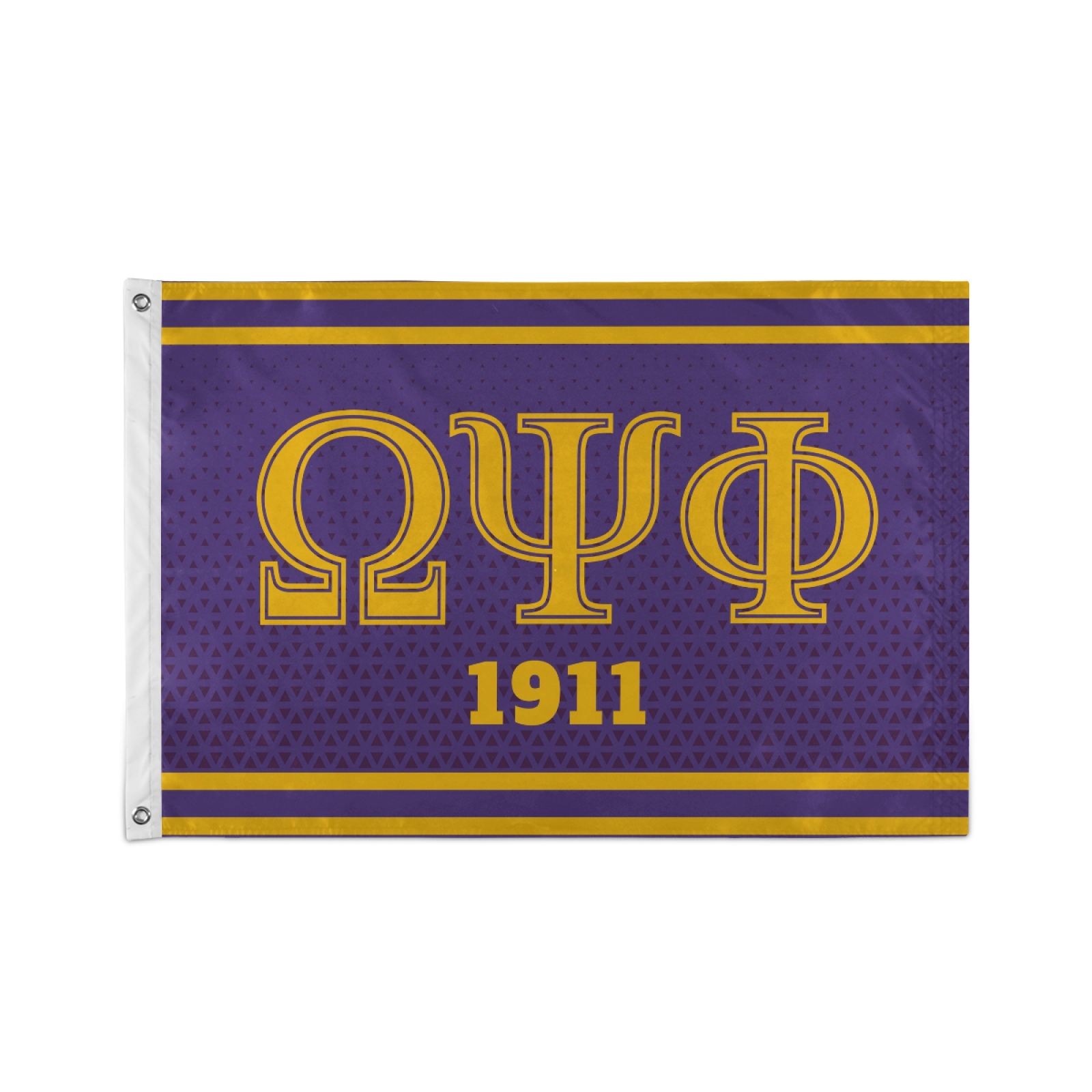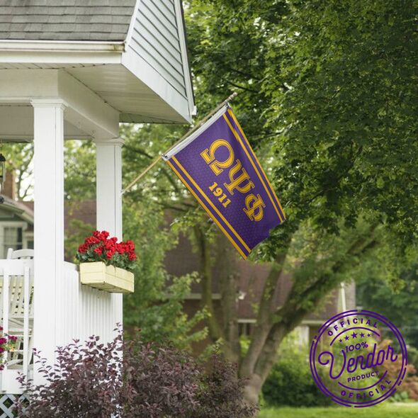 This Omega Psi Phi wall banner flag is crafted from 100% polyester fabric and designed for both indoor and outdoor use. Measuring 3 feet by 5 feet, it includes two metal-reinforced grommets for easy hanging in dorm rooms, fraternity houses, porches, or home spaces. The design features the Omega Psi Phi Greek letters and coat of arms in a vibrant print that remains visible from a distance.