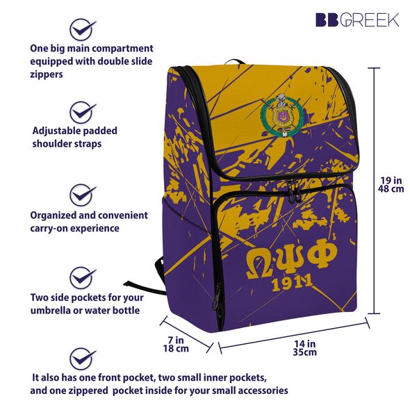 This backpack is designed with comprehensive organization in mind, featuring a spacious main compartment with double-slide zippers that can securely hold laptops up to 15 inches. Additional storage includes two side pockets for water bottles or umbrellas, a front pocket, two smaller inner pockets, and a secure zippered pocket for valuables. With dimensions of 19 inches in height, 14 inches in width, and 7 inches in depth, this bag offers versatility, whether used as a school backpack, a professional bag, or a travel carry-on. This product is officially licensed by Omega Psi Phi Fraternity, Inc., ensuring authenticity and quality aligned with the organization’s standards.
