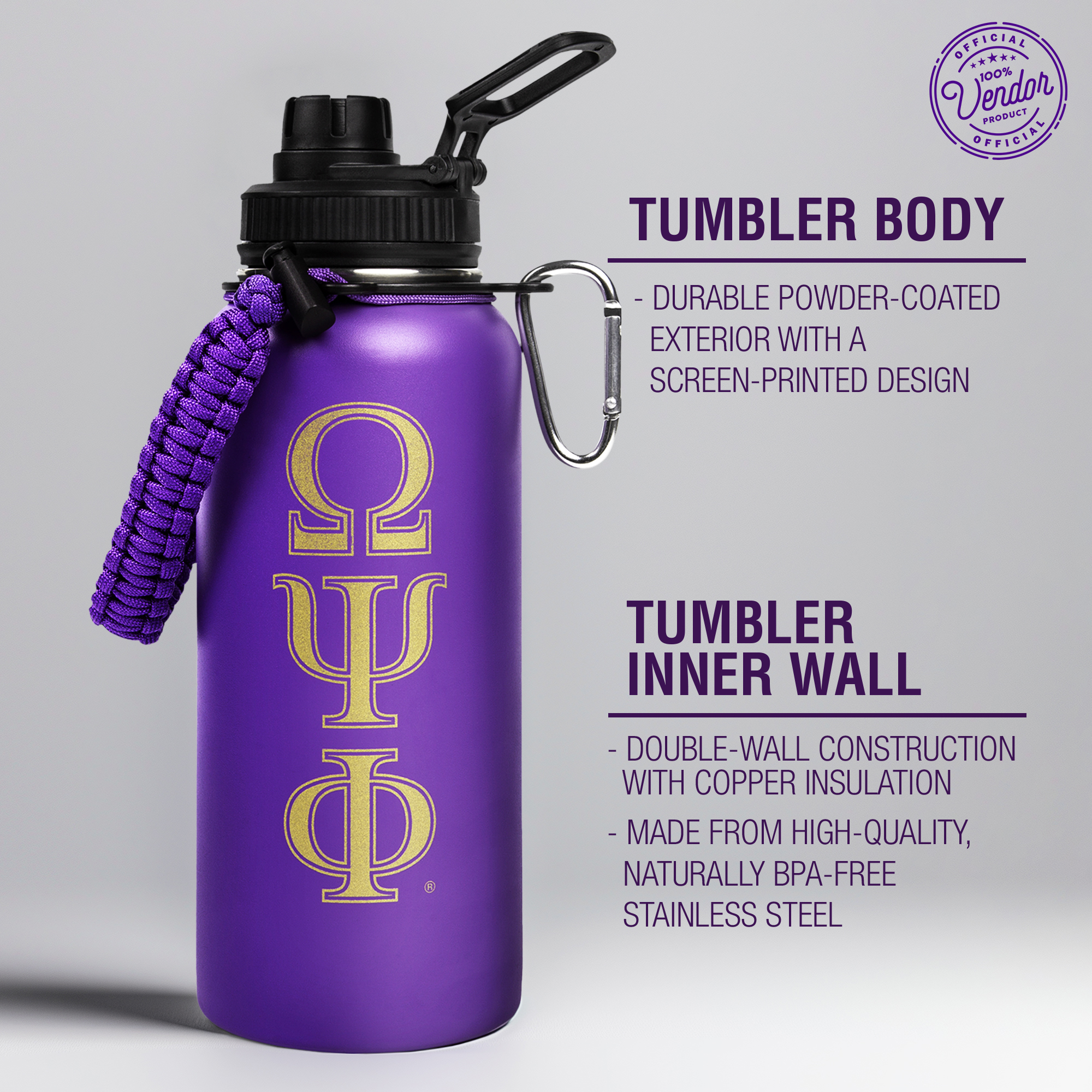 Crafted with stainless steel and a powder-coated finish, the tumbler features a laser-engraved Omega Psi Phi design for lasting durability. It offers a 32-ounce capacity and advanced insulation for temperature retention. The leak-resistant lid enhances portability, making it a dependable choice for various activities and environments.