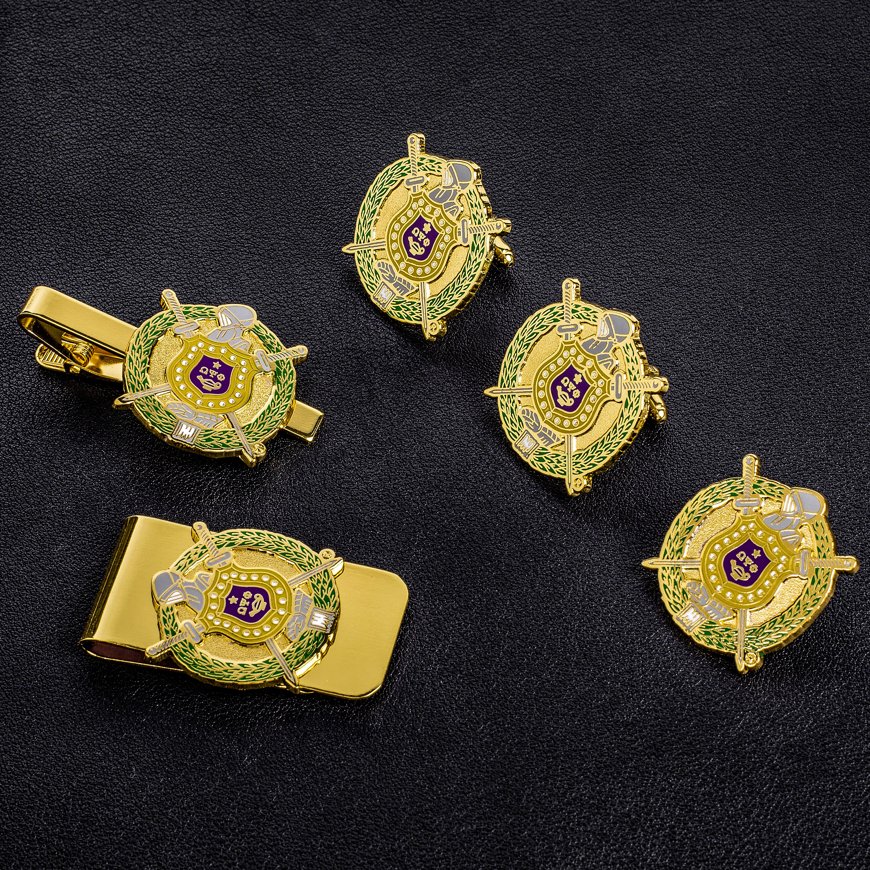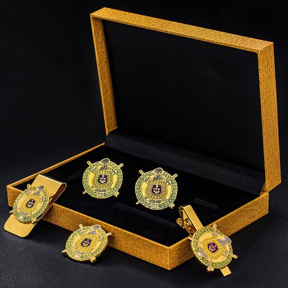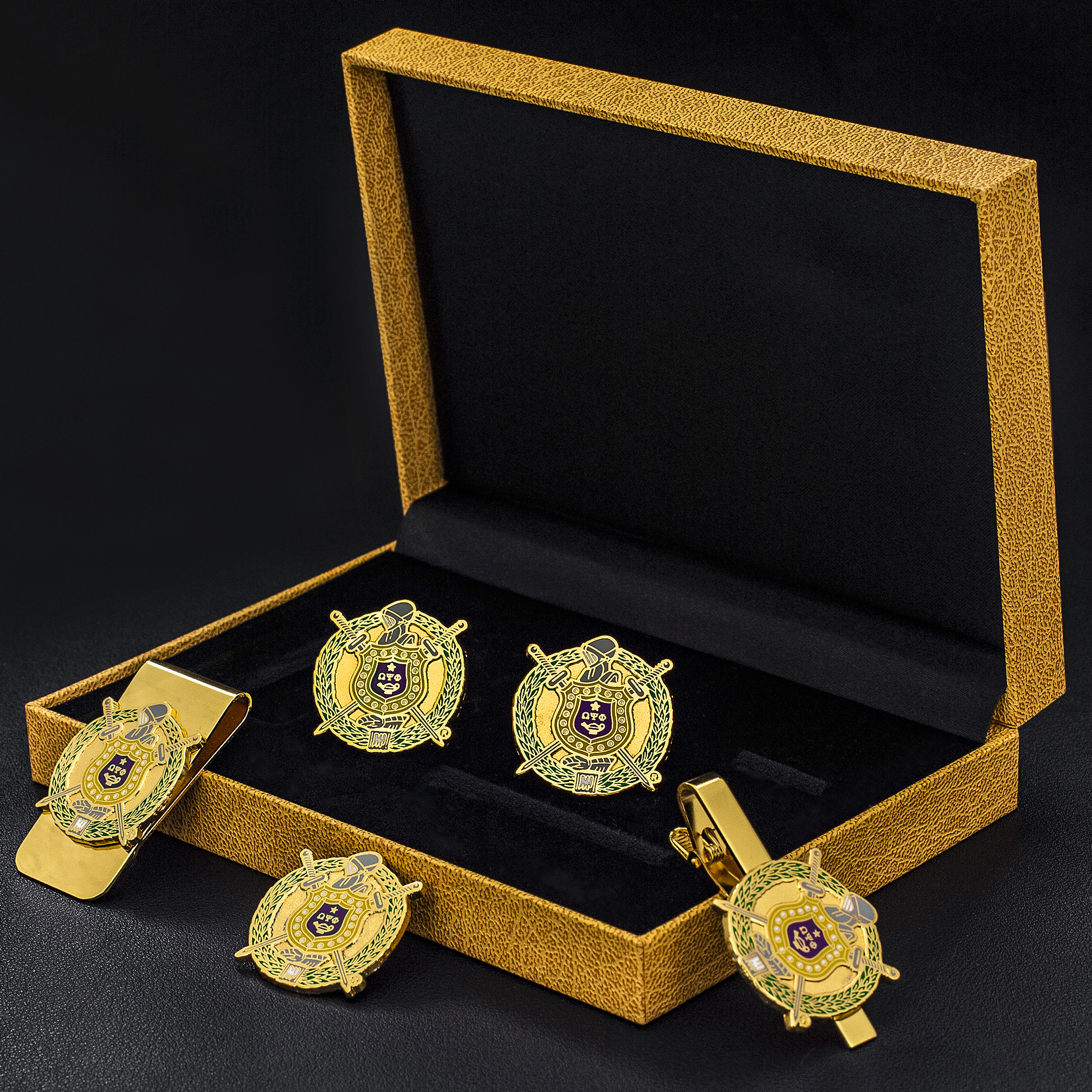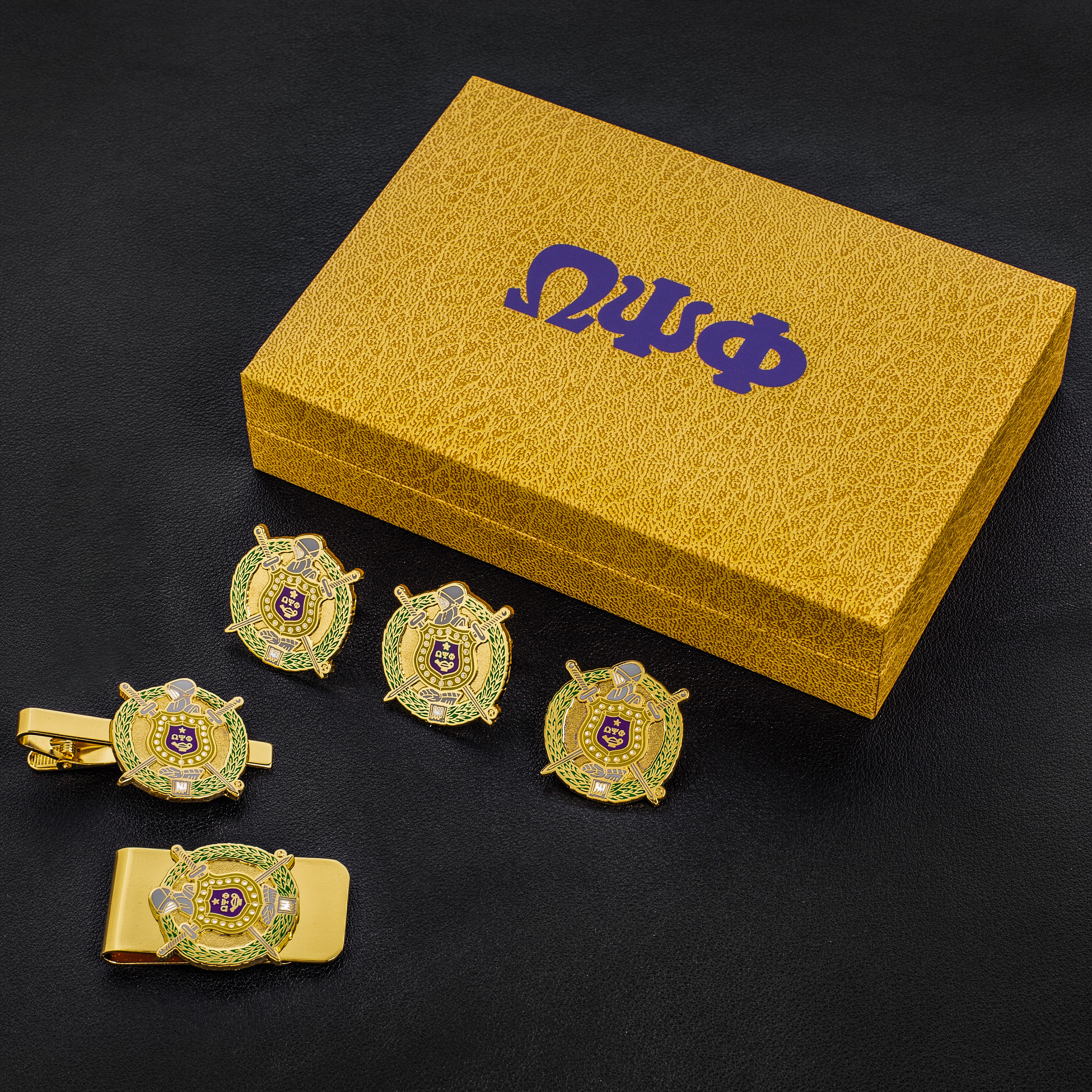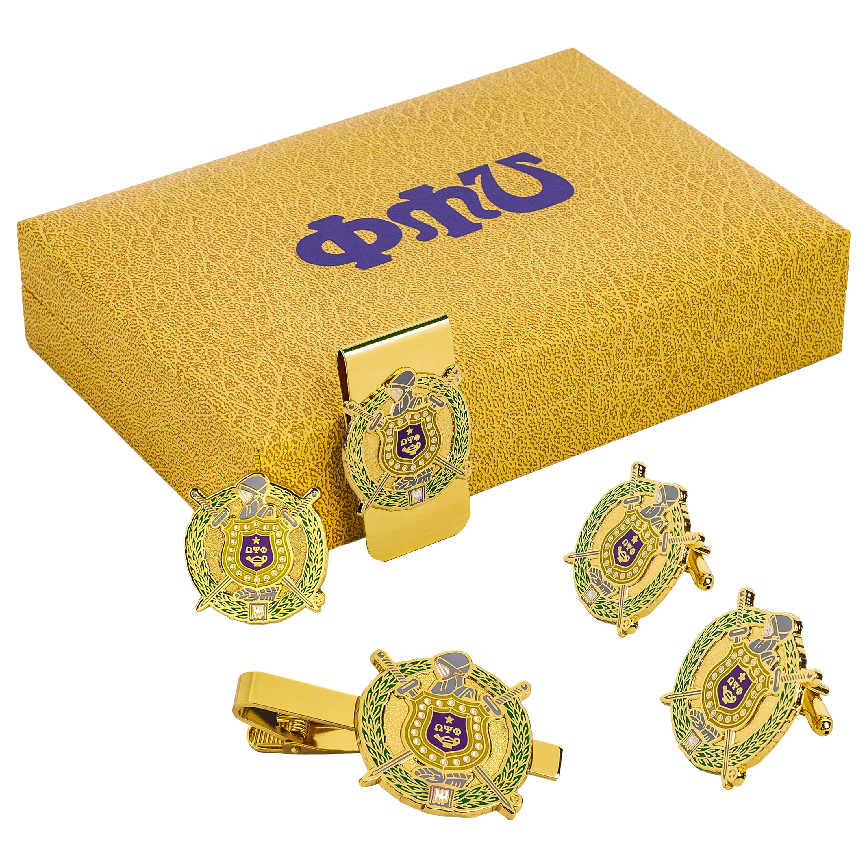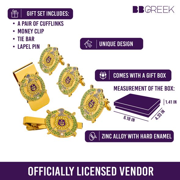 Omega Psi Phi Gift Set: Celebrate omega psi phi pride with this professional men's gift set includes a pair of cufflinks, a money clip, a tie clip, and a lapel pin. ideal for birthdays, anniversaries, and special occasions. as an official vendor, we offer authentic, high-quality fraternity items that honor the legacy of omega psi phi.