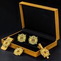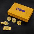 A thoughtful yet stylish gift for Omega Psi Phi men, this fraternity gift set is perfect for your favorite QUE brother, friend, coworker or relative. This men's gift set includes a pair of shiny nickel-plated cufflinks, a tie bar, a money clip, and a lapel pin with a butterfly clutch all made of zinc alloy with hard enamel material. These durable men's accessories are perfect for birthdays, graduation, anniversaries, and other special occasions. Perfect to wear at any fraternity parties and events!