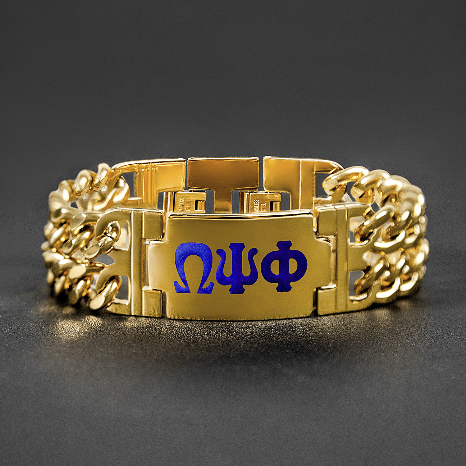 This stainless steel bracelet is designed with Omega Psi Phi Fraternity, Inc. members in mind. Crafted from hypoallergenic, non-tarnish stainless steel, it features an engraved Greek letter design on the front and a recessed logo on the back. The coated and polished finish enhances durability, making it a lasting and meaningful accessory.