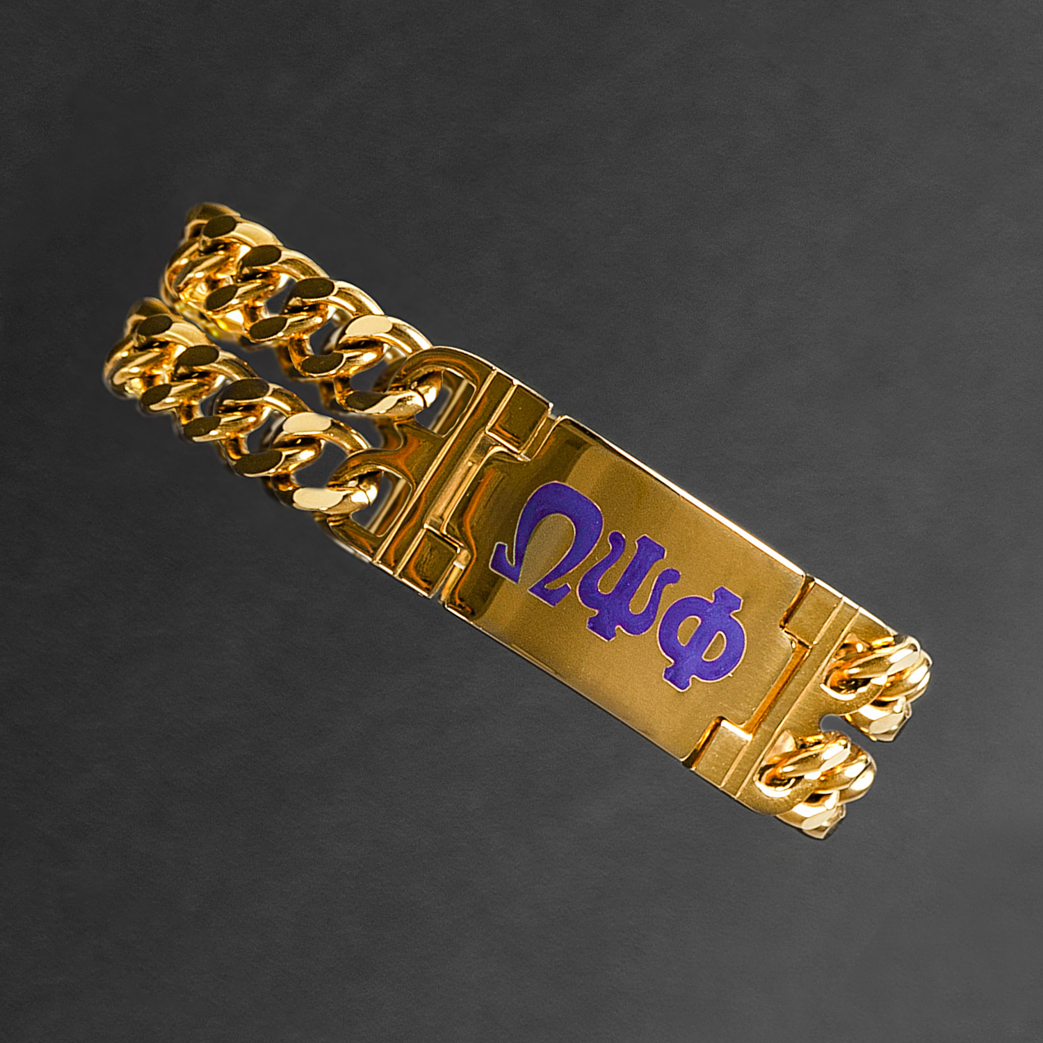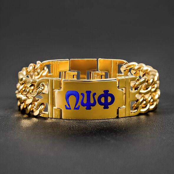 OMEGA PSI PHI HEAVY BRACELET: Crafted with precision, this bracelet features engraved Omega Psi Phi Greek letters. The soft enamel detailing adds depth to the design, creating a timeless piece that complements any look.