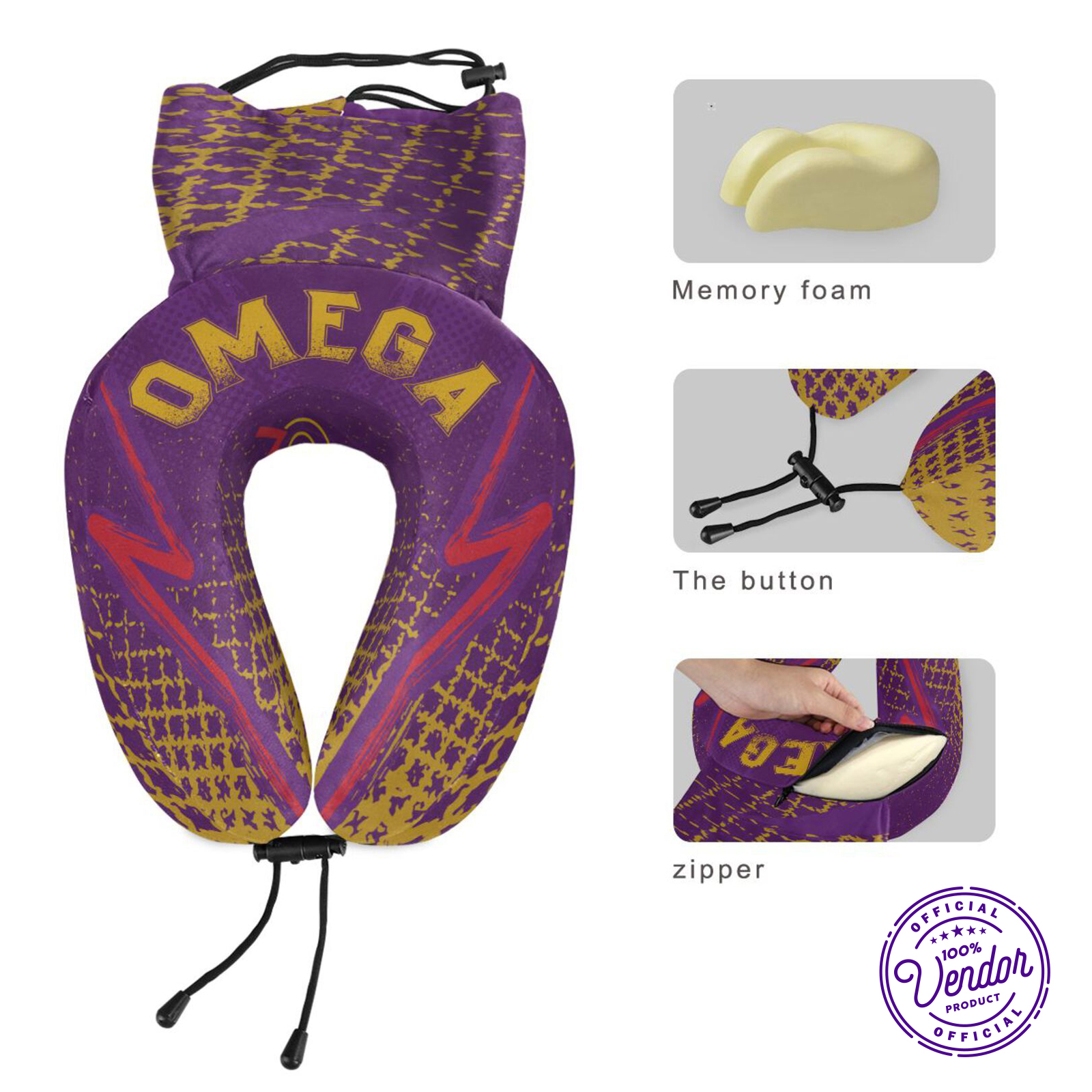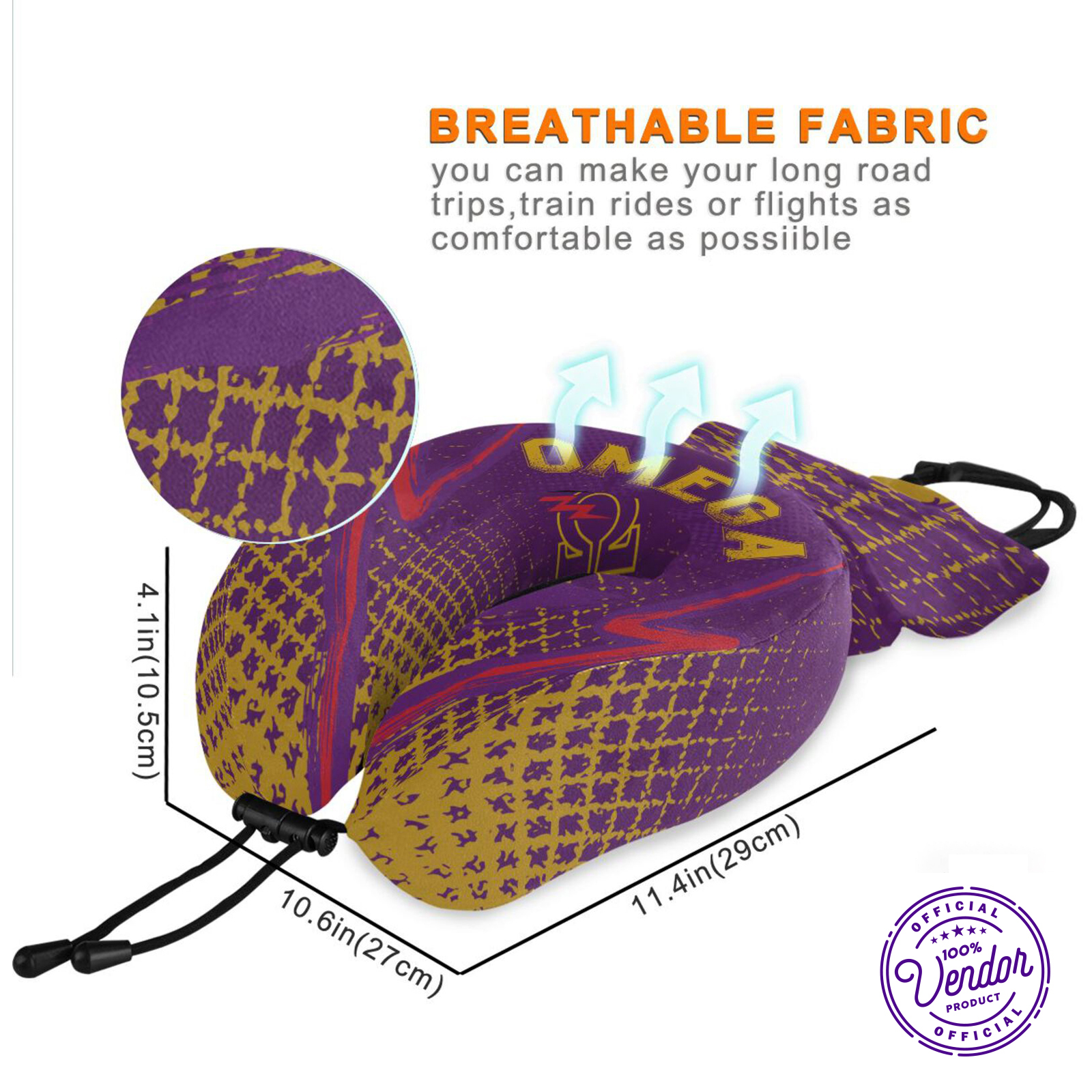 The Omega neck pillow is not just comfortably snug but also visually attractive. The fabric cover is an invitingly soft, breathable velvet, chosen purposefully to avoid any discomfort during your sleep. Taking inspiration from the Omega Psi Phi fraternity's official colors, the fabric features a rich, regal blend of purple and gold. The exceptional design doesn't neglect practical convenience—each pillow is sold with a minimalist storage bag to simplify packing and save space—it's easily attachable to a carry-on bag or suitcase. Additionally, this neck pillow boasts a robust zipper along with an easy-to-launder fabric cover. It's the perfect combination of comfort, style, and convenience. An adjustable drawstring tie complements the pillow, making further adjustments a breeze. In terms of dimensions, the pillow measures a compact but cushy 6.7 x 7.5 inches (or 17cm x 19cm), making it the perfect, subtle addition to your travel gear. With this Omega neck pillow, your travel experience can be the fusion of ultimate comfort and style!