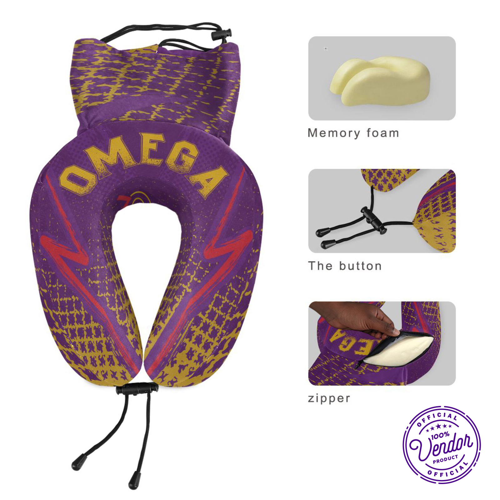The Omega neck pillow is not just comfortably snug but also visually attractive. The fabric cover is an invitingly soft, breathable velvet, chosen purposefully to avoid any discomfort during your sleep. Taking inspiration from the Omega Psi Phi fraternity's official colors, the fabric features a rich, regal blend of purple and gold. The exceptional design doesn't neglect practical convenience—each pillow is sold with a minimalist storage bag to simplify packing and save space—it's easily attachable to a carry-on bag or suitcase. Additionally, this neck pillow boasts a robust zipper along with an easy-to-launder fabric cover. It's the perfect combination of comfort, style, and convenience. An adjustable drawstring tie complements the pillow, making further adjustments a breeze. In terms of dimensions, the pillow measures a compact but cushy 6.7 x 7.5 inches (or 17cm x 19cm), making it the perfect, subtle addition to your travel gear. With this Omega neck pillow, your travel experience can be the fusion of ultimate comfort and style!