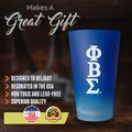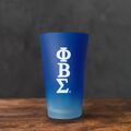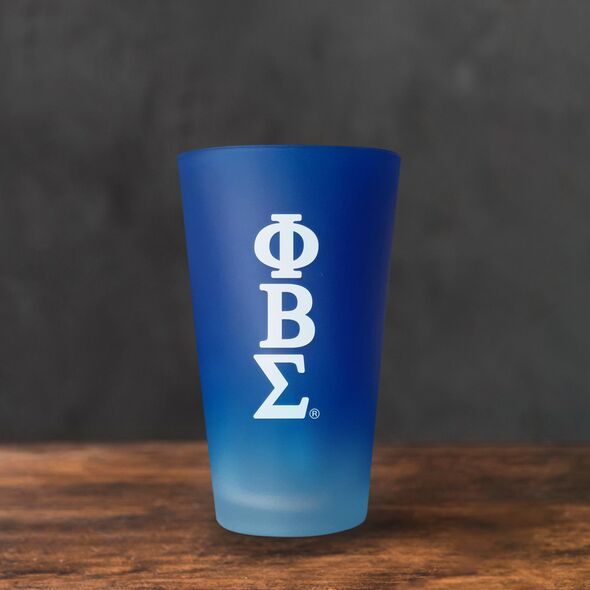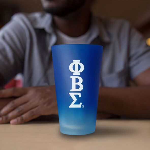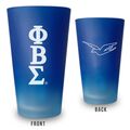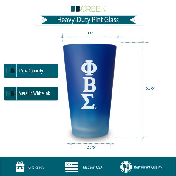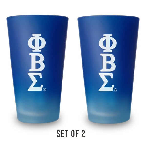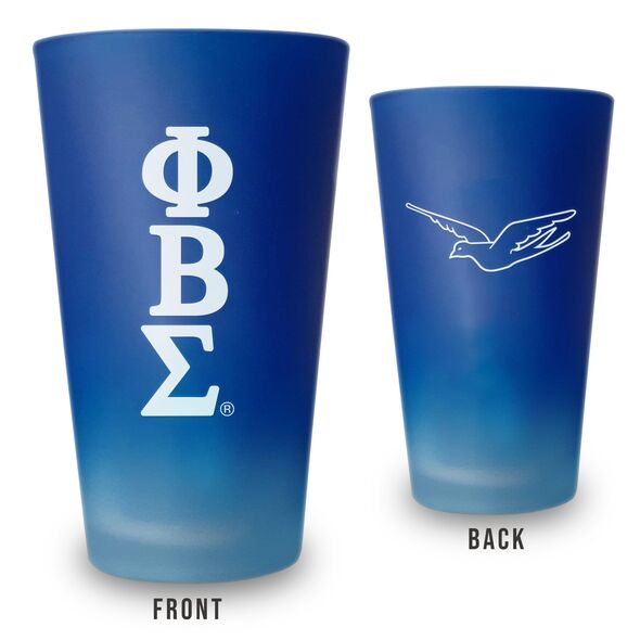 Give the gift of delight with this unique Phi Beta Sigma Set of 2 16 ounce mixing pint glasses. These two-tone frosted beer glasses are printed with a blue and white matte ombre color with vibrant Greek letters and a dove design. It's the perfect fraternity gift for a treasured Sigma brother, coworker, staff member, subordinate or boss!