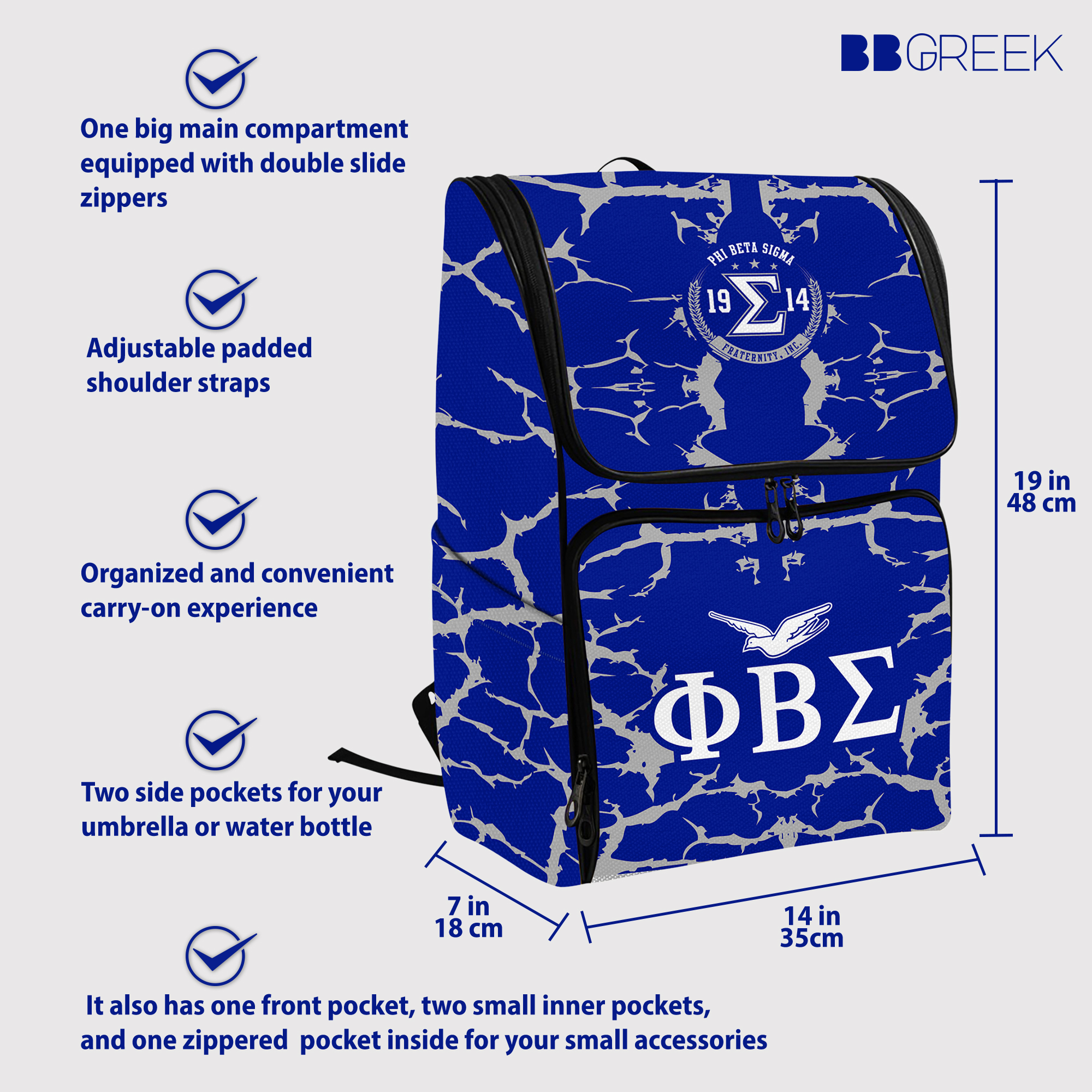 BACKPACK COMPARTMENTS: This Phi Beta Sigma backpack features one big main compartment equipped with double slide zippers, adjustable padded shoulder straps, and two side pockets for your umbrella or water bottle. It also has one front pocket, two small inner pockets, and one zippered pocket inside for your small accessories such as pens, cables, phones, earbuds, and power banks for a more organized and convenient carry-on experience.