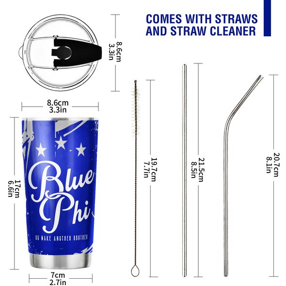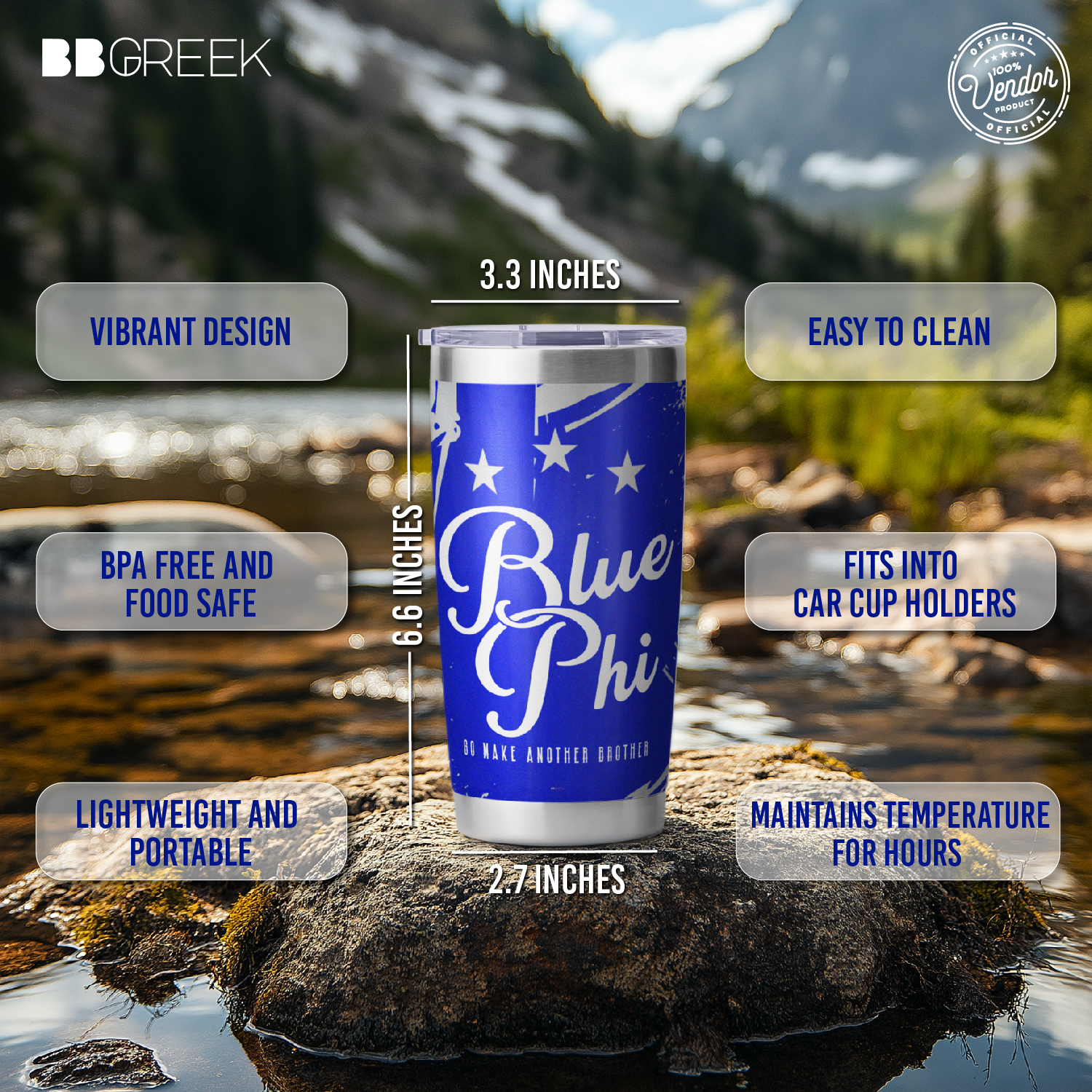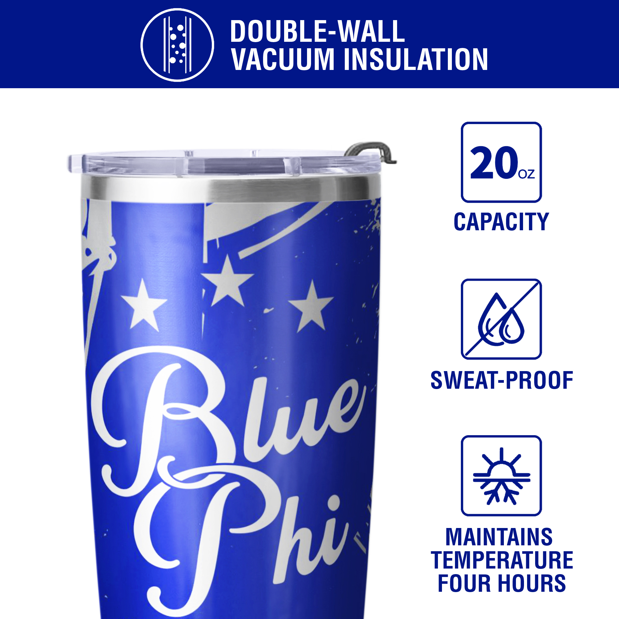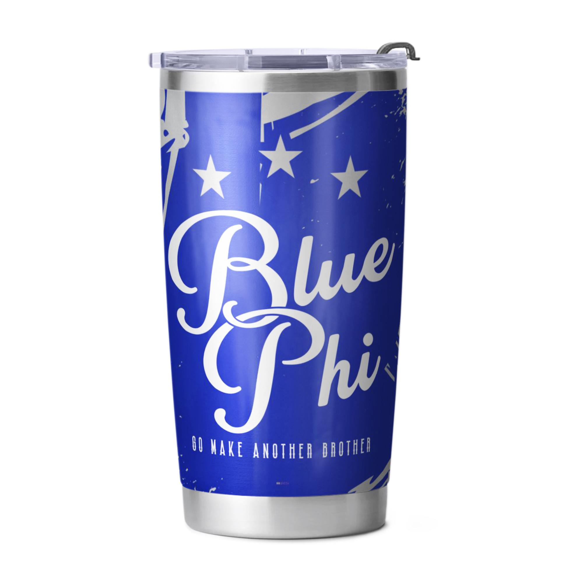 PHI BETA SIGMA TUMBLER: This 20 oz stainless steel tumbler features the elegant "Blue Phi" Design, reflecting the values of Phi Beta Sigma Fraternity. Its vibrant and stylish design adds charm and practicality to daily hydration routines.