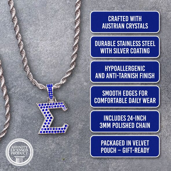 The pendant is made from non-allergenic stainless steel and finished with an anti-tarnish silver coating for a skin-safe and lasting finish. The mirror-polished back adds a subtle shine, while the crystal-encrusted front showcases the fraternity’s colors and symbols in a stylish form. The chain offers a secure and versatile fit for various personal styles.