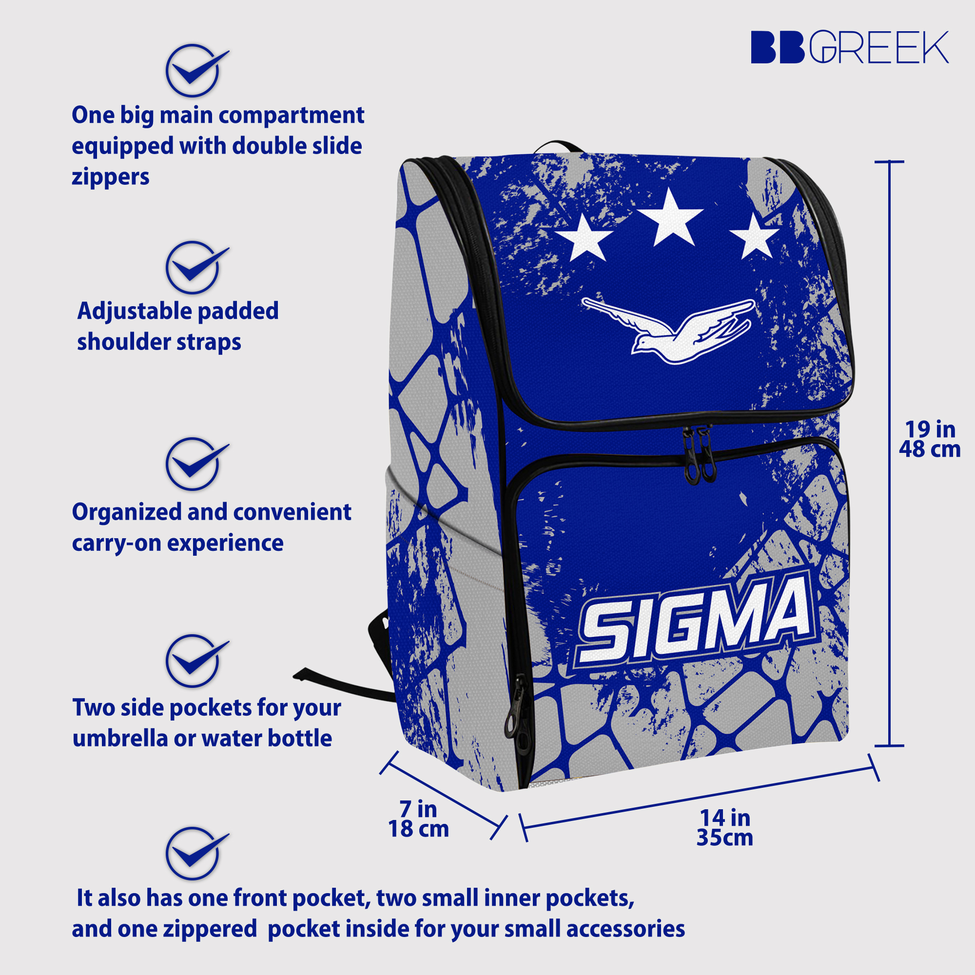 BAG COMPARTMENTS: This Phi Beta Sigma bag features one big main compartment equipped with double slide zippers, adjustable padded shoulder straps, and two side pockets for your umbrella or water bottle. It also has one front pocket, two small inner pockets, and one zippered pocket inside for your small accessories such as pens, cables, phones, earbuds, and power banks for a more organized and convenient carry-on experience.