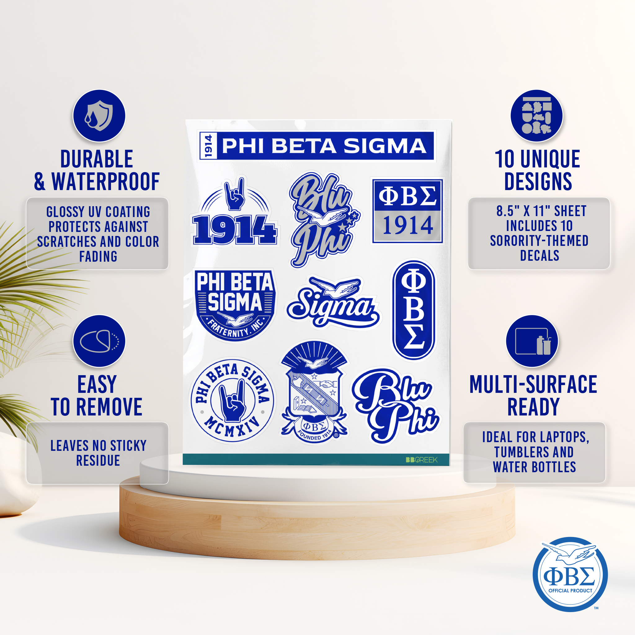 These Phi Beta Sigma decal stickers are designed for versatility and durability, crafted from waterproof white PVC material with a glossy UV lamination. Each sheet measures 8.5 x 11 inches and includes 10 individual stickers, making them ideal for personalizing laptops, water bottles, tumblers, or other surfaces. The high-quality materials ensure long-lasting use while maintaining vibrant colors and sharp details.