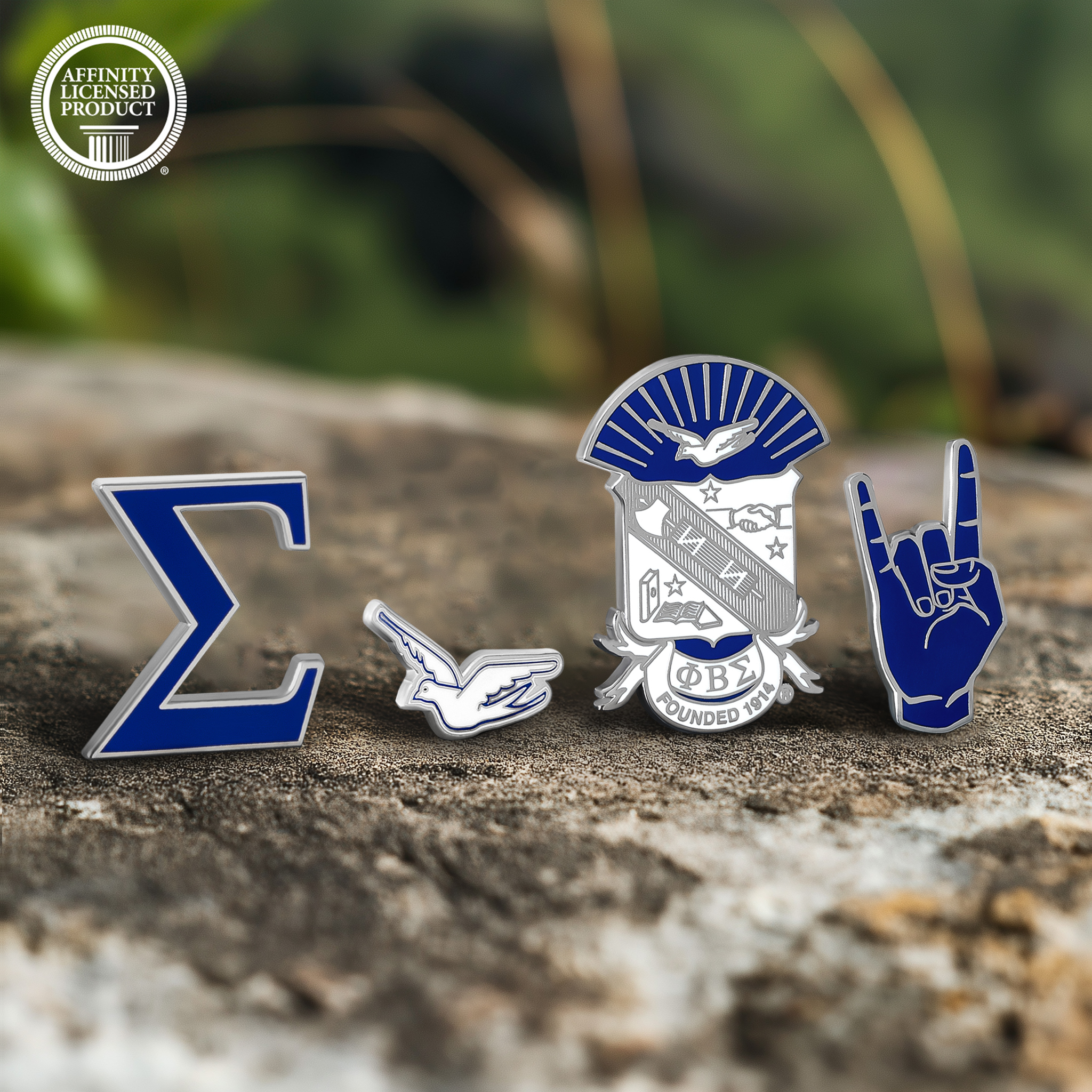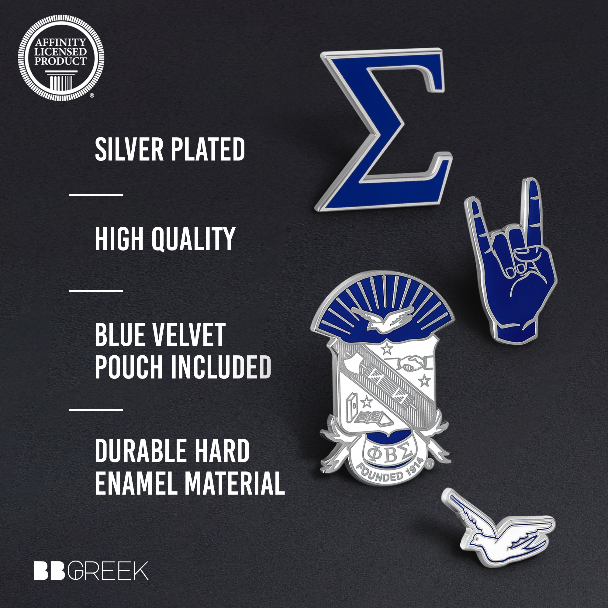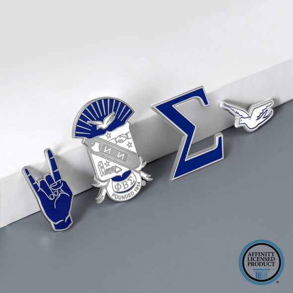 Phi Beta Sigma Lapel Pin Set: This set includes four high-quality large pins featuring the fraternity’s most recognizable symbols: a 1.25-inch Sigma symbol pin, a 1.5-inch dove pin, a 1.5-inch hand sign pin, and a 2-inch shield pin. Each pin represents Phi Beta Sigma pride with vibrant color and detail.