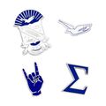 • Set includes four pins: 1.25" Sigma, 1.5" dove, 1.5" hand sign, 2" shield