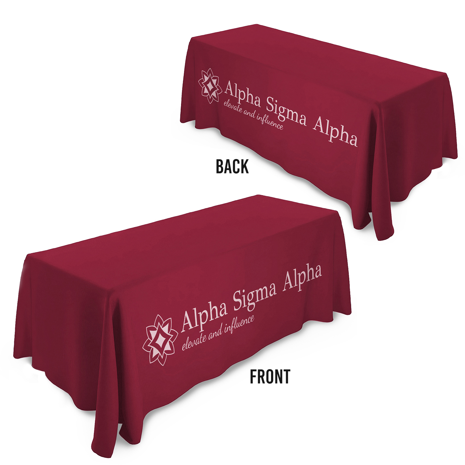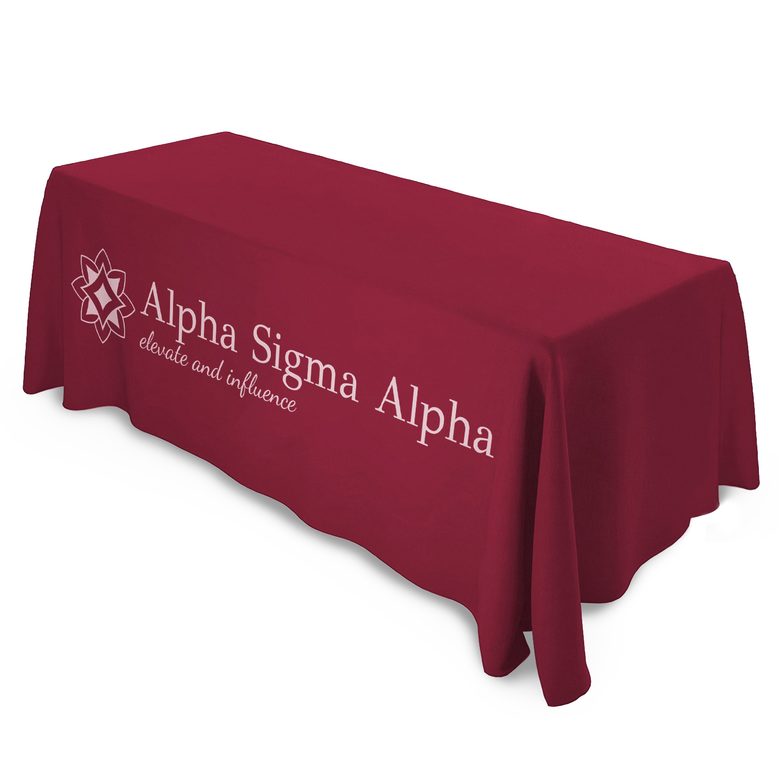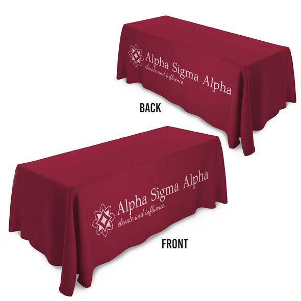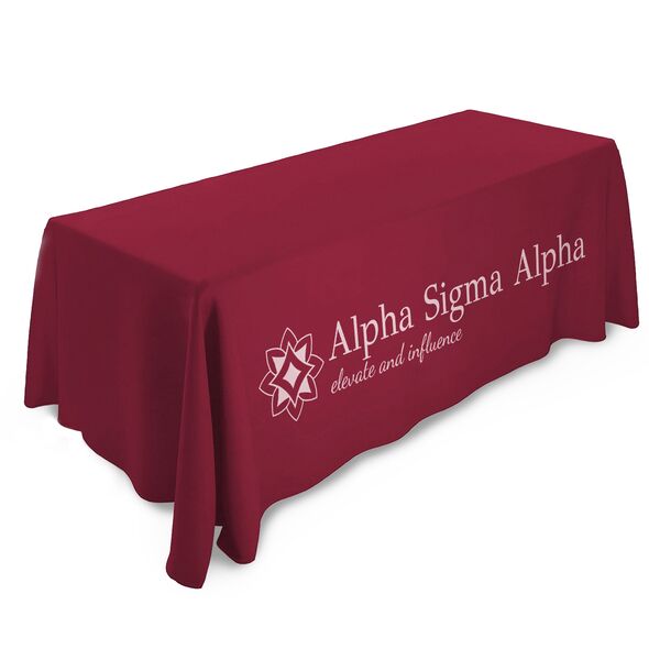 ALPHA SIGMA ALPHA TABLECLOTHS: Our licensed tablecloths are custom-made to order with full-color "allover" printing and precisely cut and sewn to fit ideally. For events needing custom designs, we can match colors and create unique tablecloths with an 8-week lead time, ensuring your table decor is tailored to your exact needs.