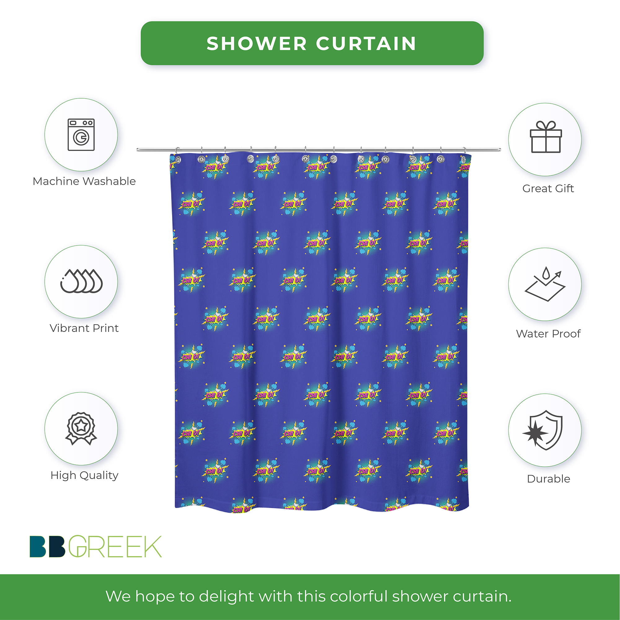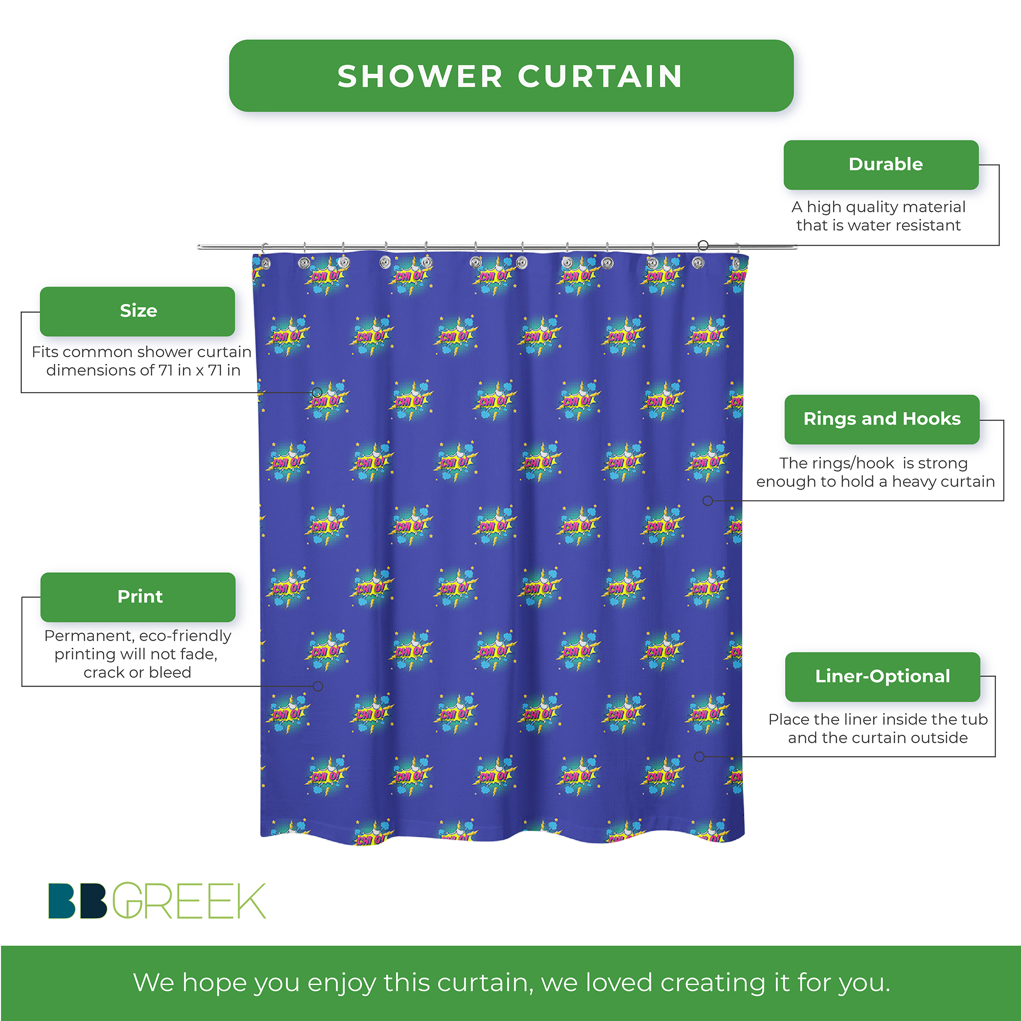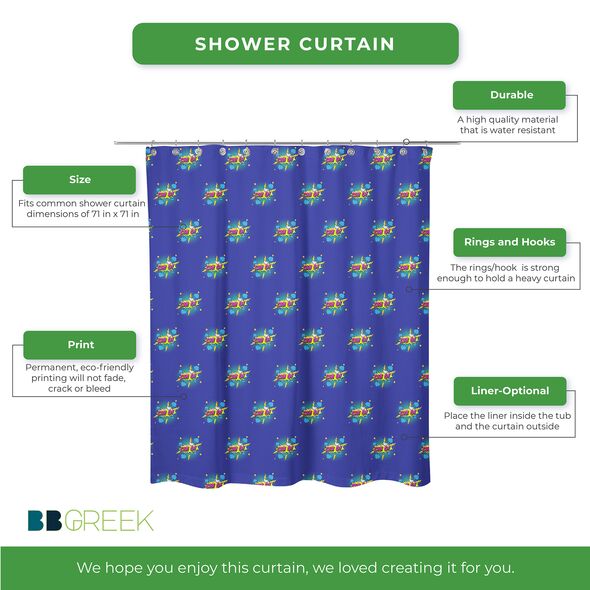 This Chi Omega shower curtain features a design that reflects the identity of Chi Omega Sorority. Sized at 71 x 71 inches, it fits most standard bathtubs and showers. Made from 100% polyester, the curtain has a water-resistant surface and a vibrant, eco-friendly print that is permanently dyed into the fabric. It is suitable for daily use and comes with installation rings for convenience. Please note that a liner is not included.