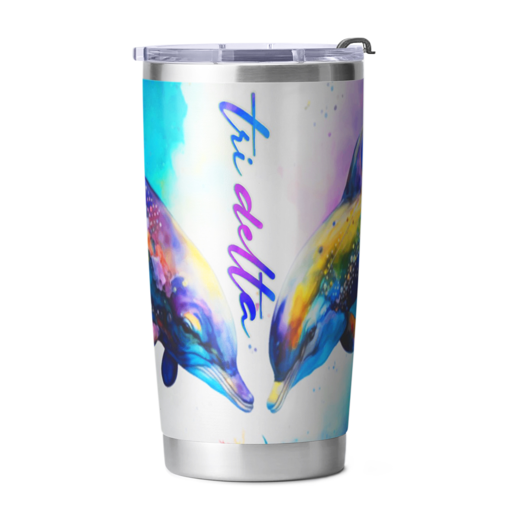 TRI DELTA TUMBLER: This 20 oz stainless steel tumbler features the elegant "Dolphins" design, reflecting the values of Tri Delta Sorority. Its vibrant and stylish design adds charm and practicality to daily hydration routines.