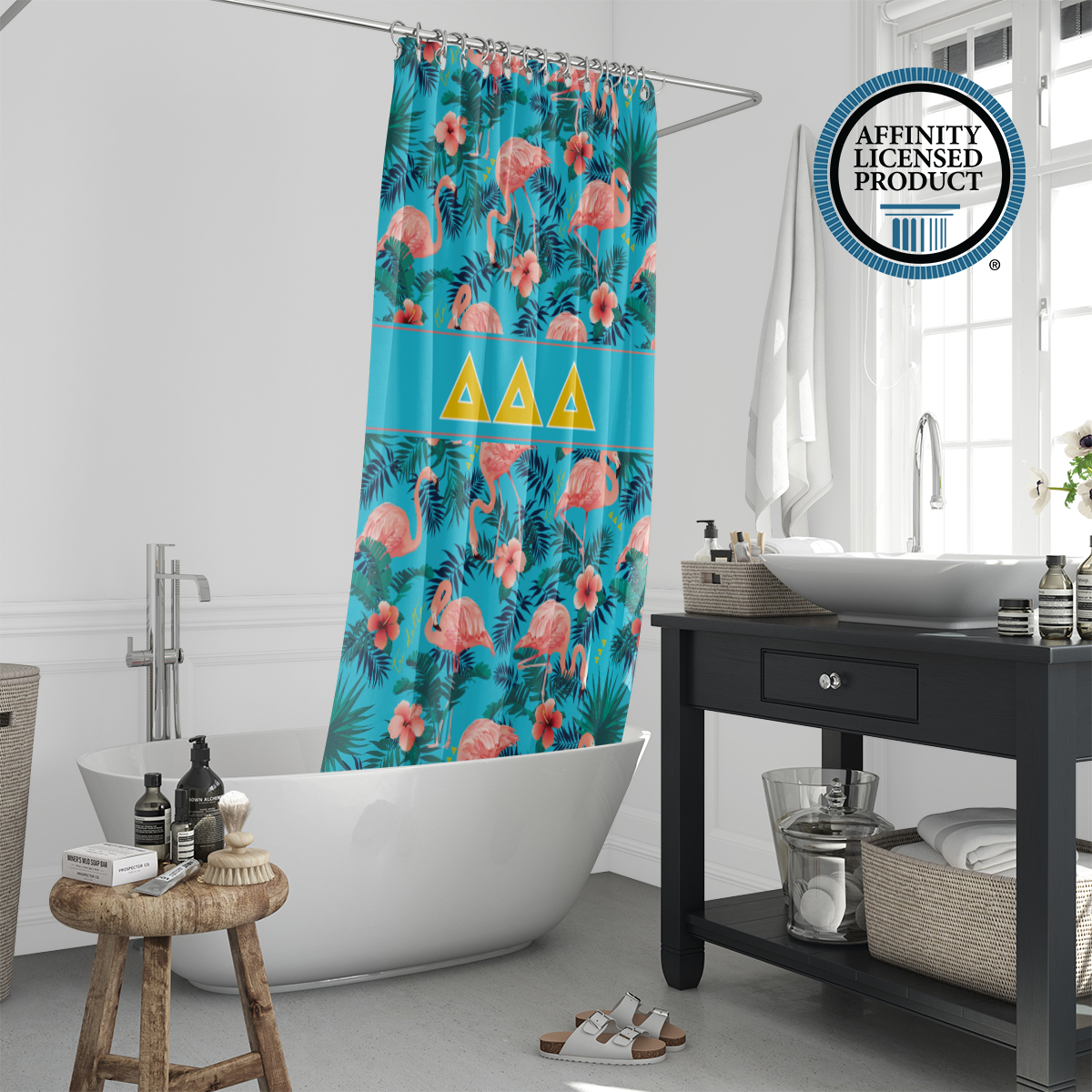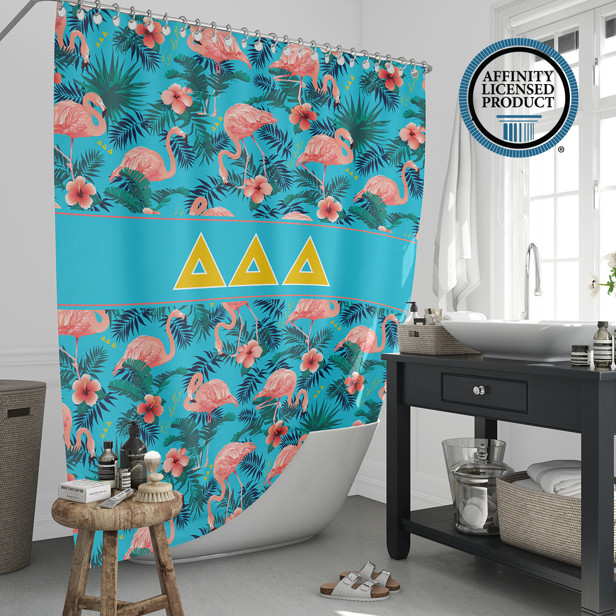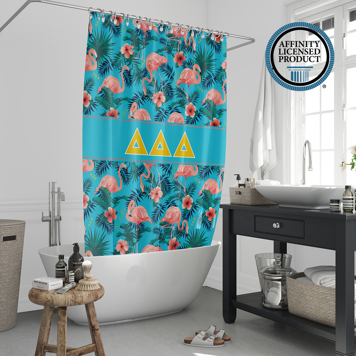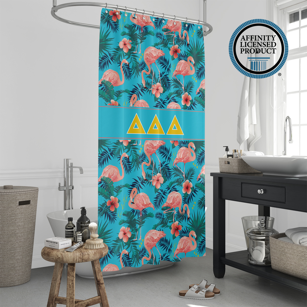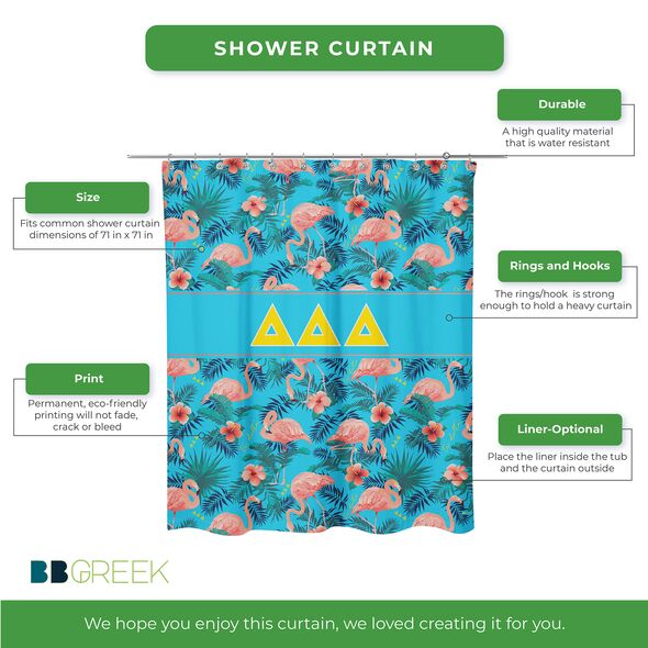 This Tri Delta shower curtain offers both visual appeal and practical use. The durable material and long-lasting print make it a reliable Tri Delta accessory for home decor. Easy to install and maintain, it adds a meaningful touch to your bathroom while reflecting sorority in a subtle, everyday way. Ideal for use in sorority houses, dorms, or personal residences.