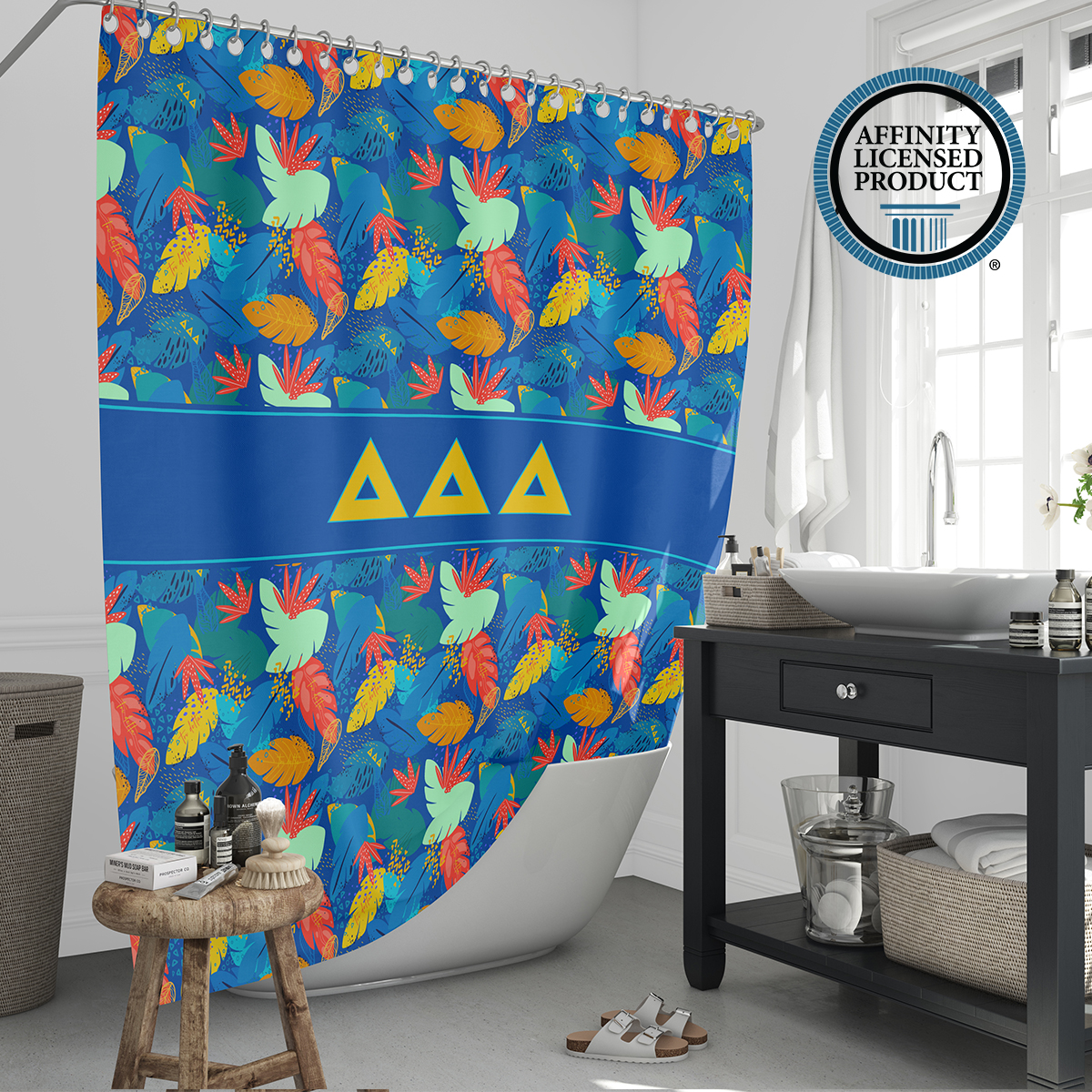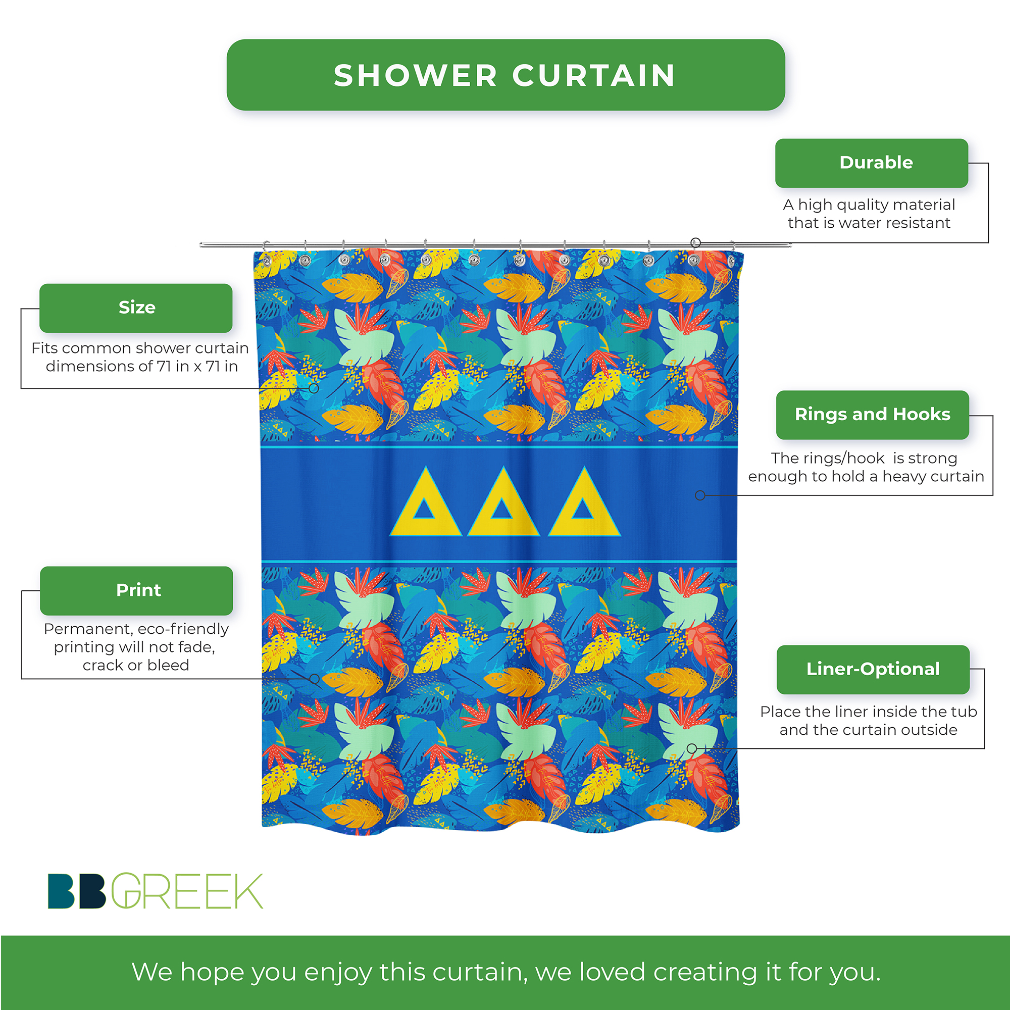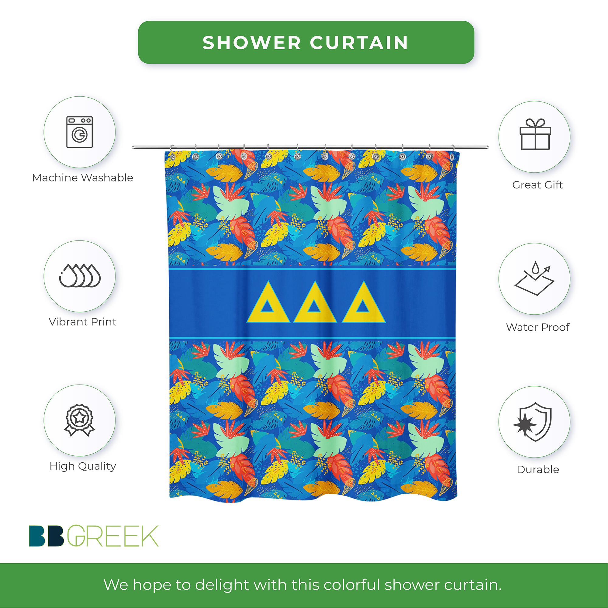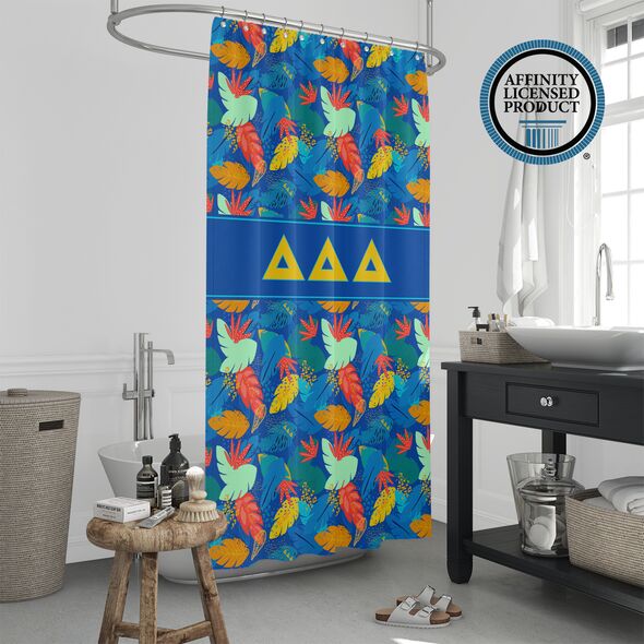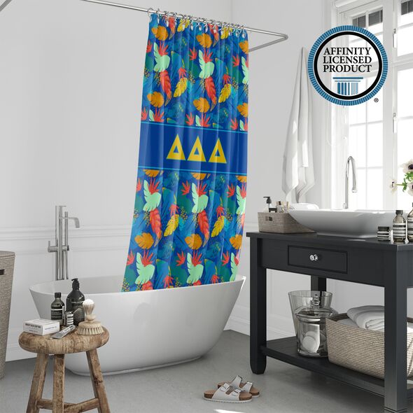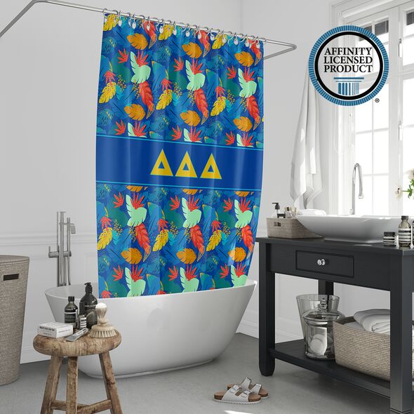 This Tri Delta shower curtain offers both visual appeal and practical use. The durable material and long-lasting print make it a reliable Tri Delta accessory for home decor. Easy to install and maintain, it adds a meaningful touch to your bathroom while reflecting sorority in a subtle, everyday way. Ideal for use in sorority houses, dorms, or personal residences.
