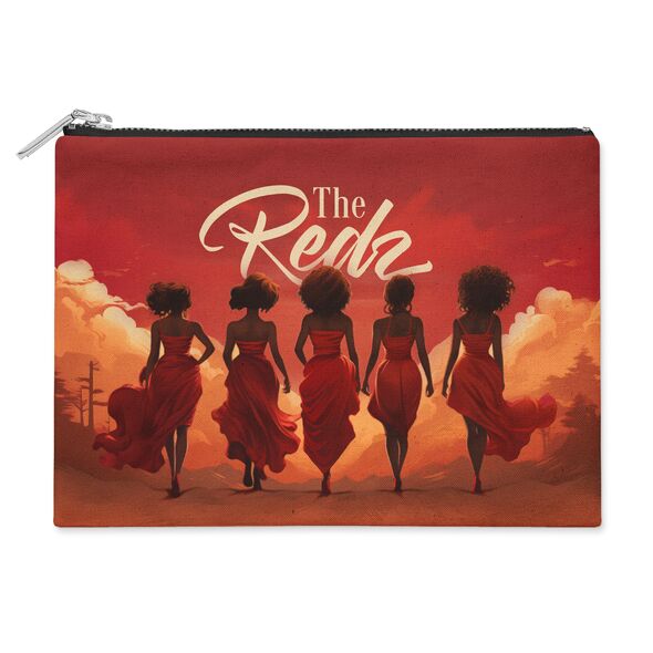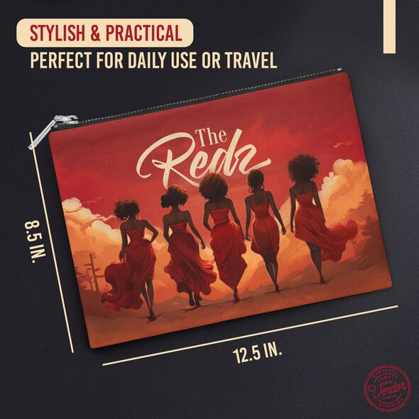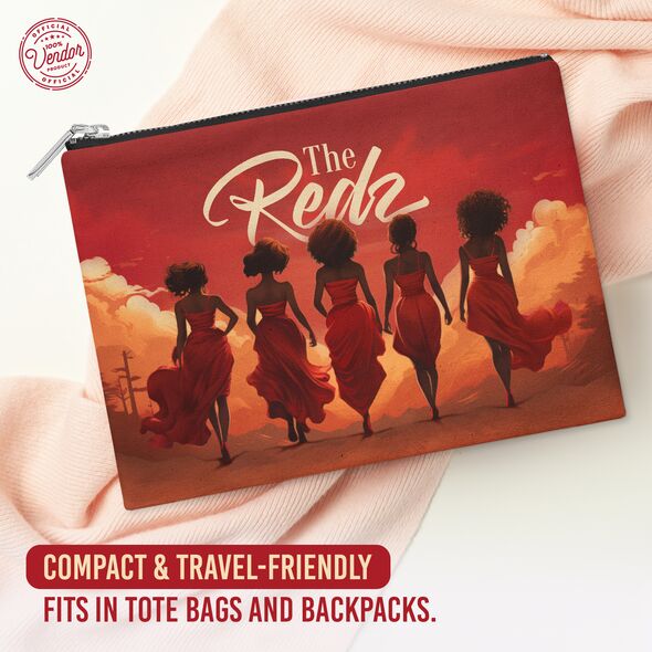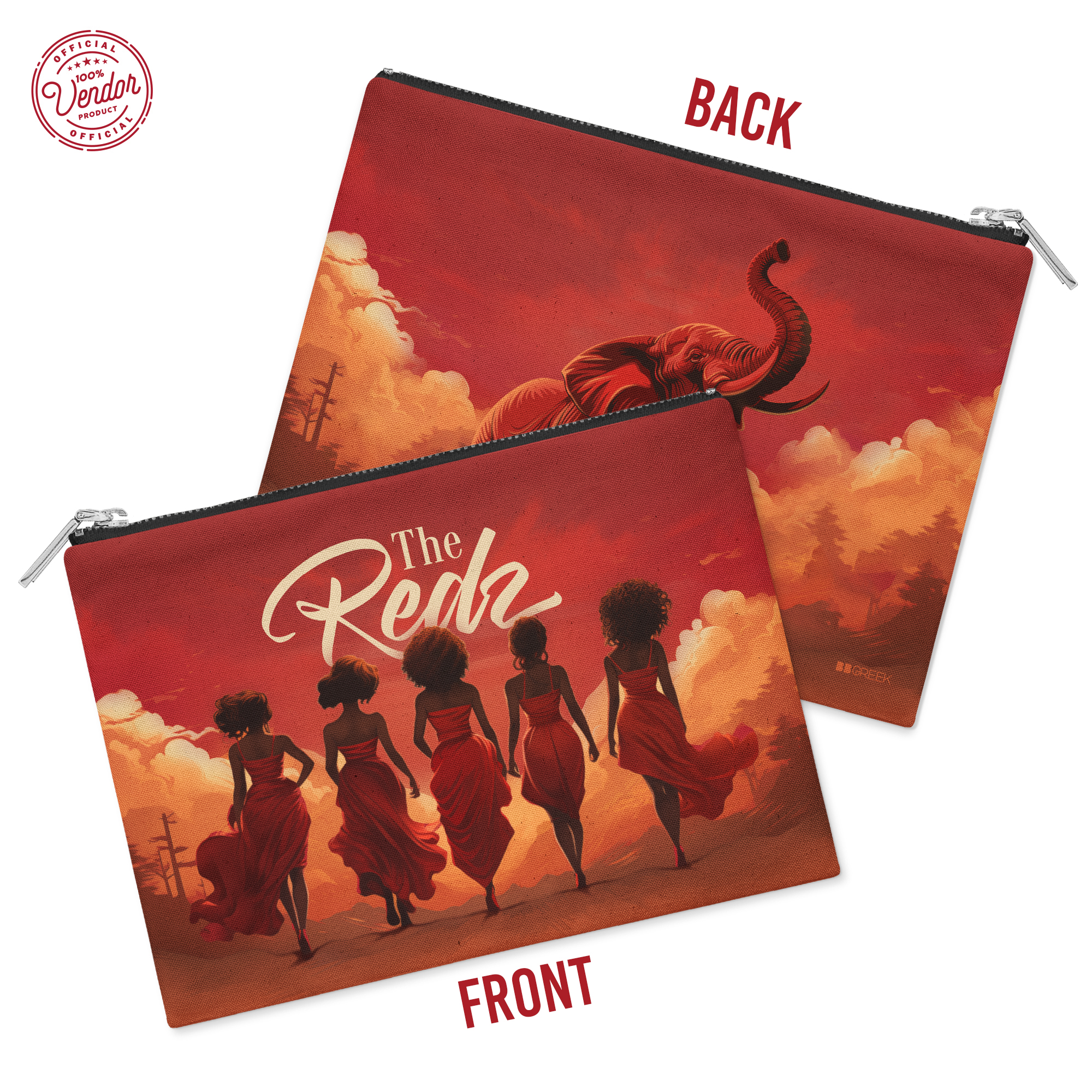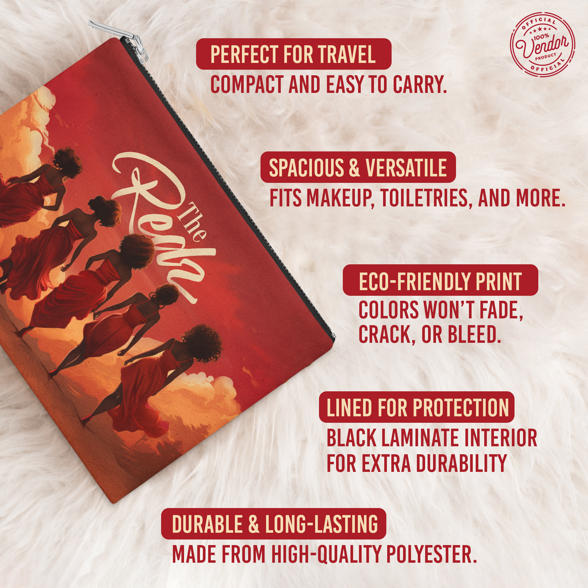 DELTA SIGMA THETA MAKEUP POUCH: This Delta Sigma Theta accessory bag features a vibrant and durable "The Redz" print, making it an essential travel pouch for organizing makeup, toiletries, or other essentials while showcasing sorority pride.