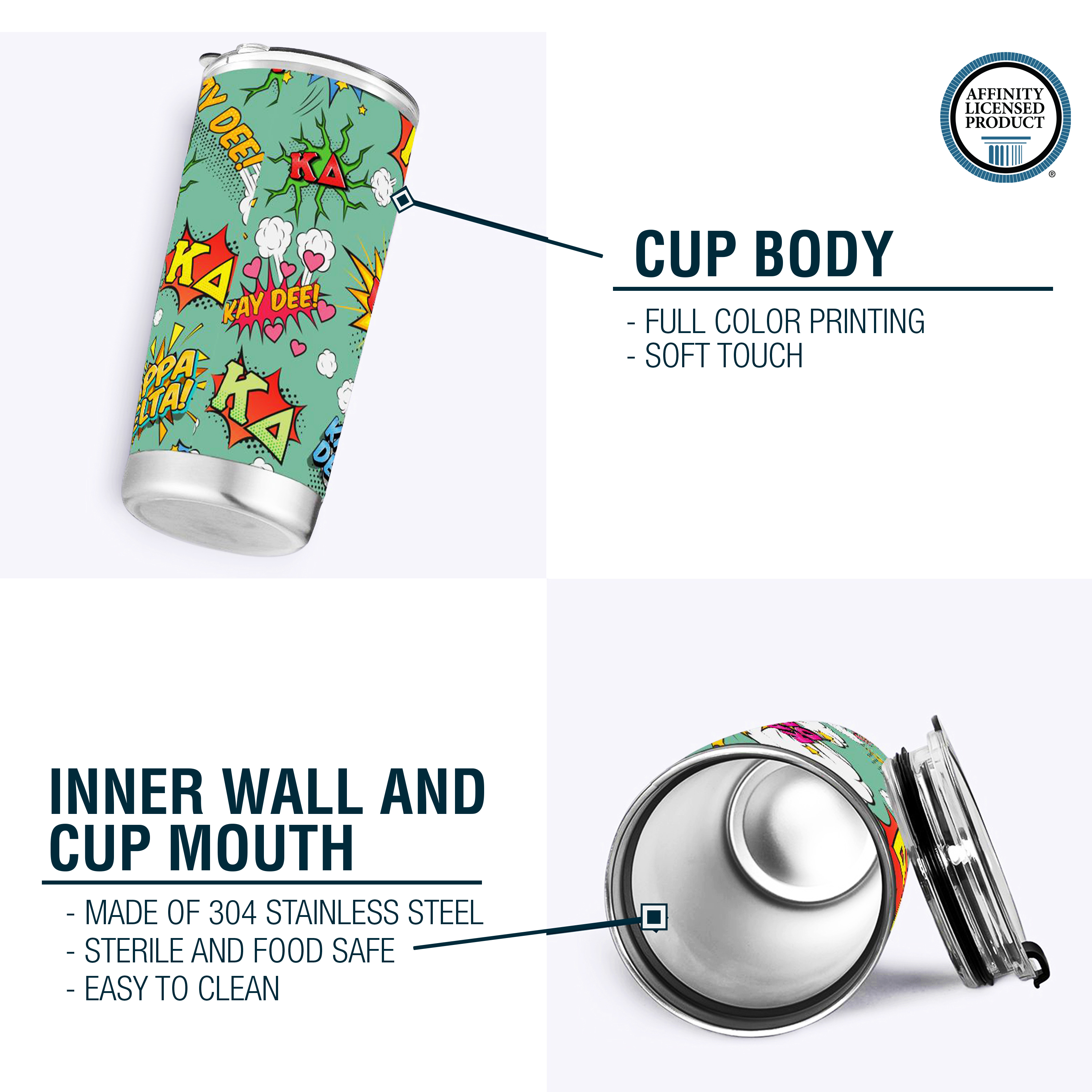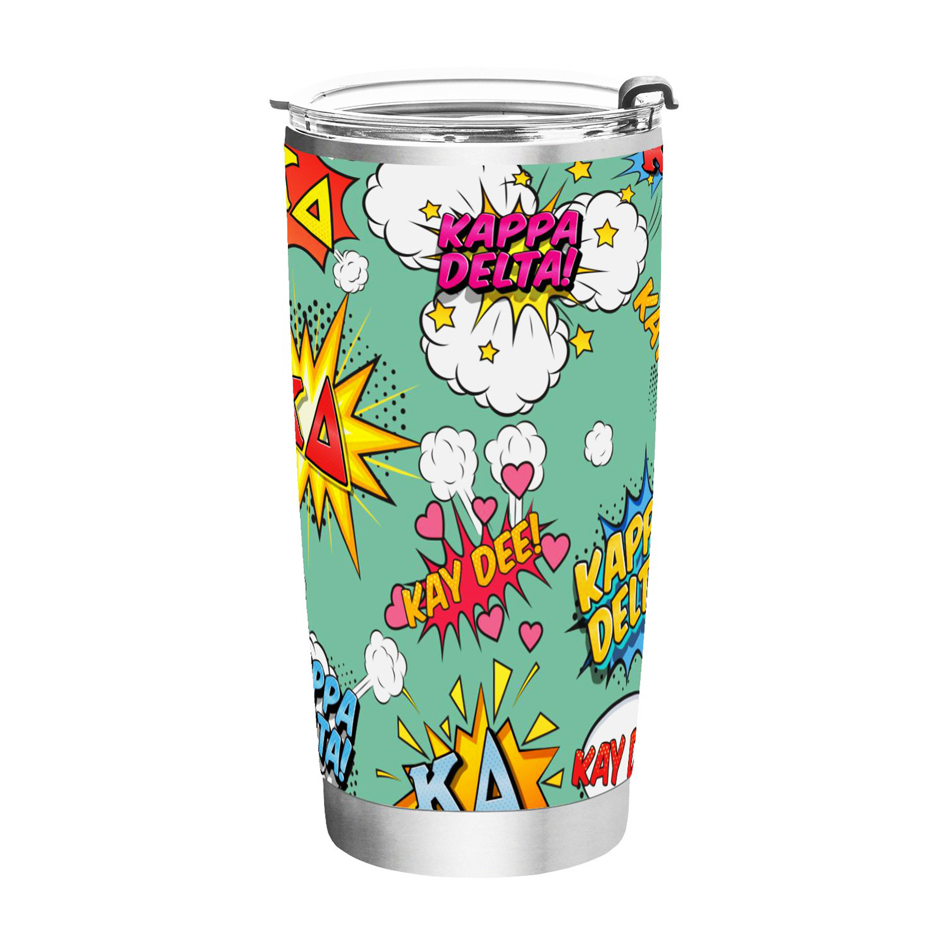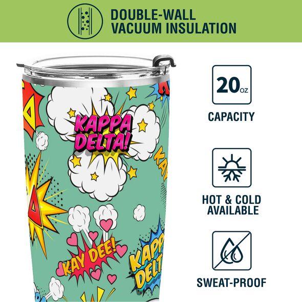 KAPPA DELTA TUMBLER: This 20 oz stainless steel tumbler features the elegant "Comic Bang" design, reflecting the values of Kappa Delta Sorority. Its vibrant and stylish design adds charm and practicality to daily hydration routines.