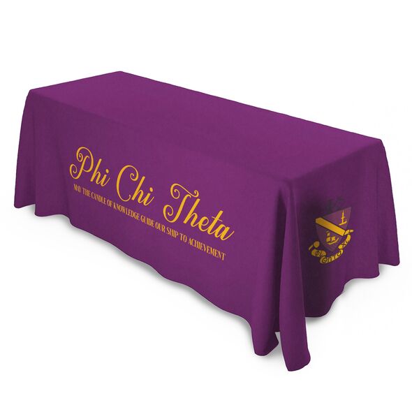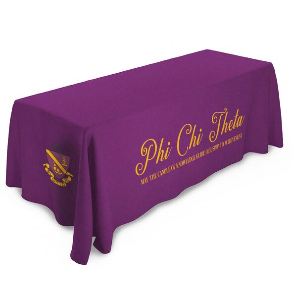 CUSTOM PHI CHI THETA TABLECLOTHS: Our licensed tablecloths are custom-made to order with full-color "allover" printing and precisely cut and sewn to fit ideally. For events needing custom designs, we can match colors and create unique tablecloths with an 8-week lead time, ensuring your table decor is tailored to your exact needs.