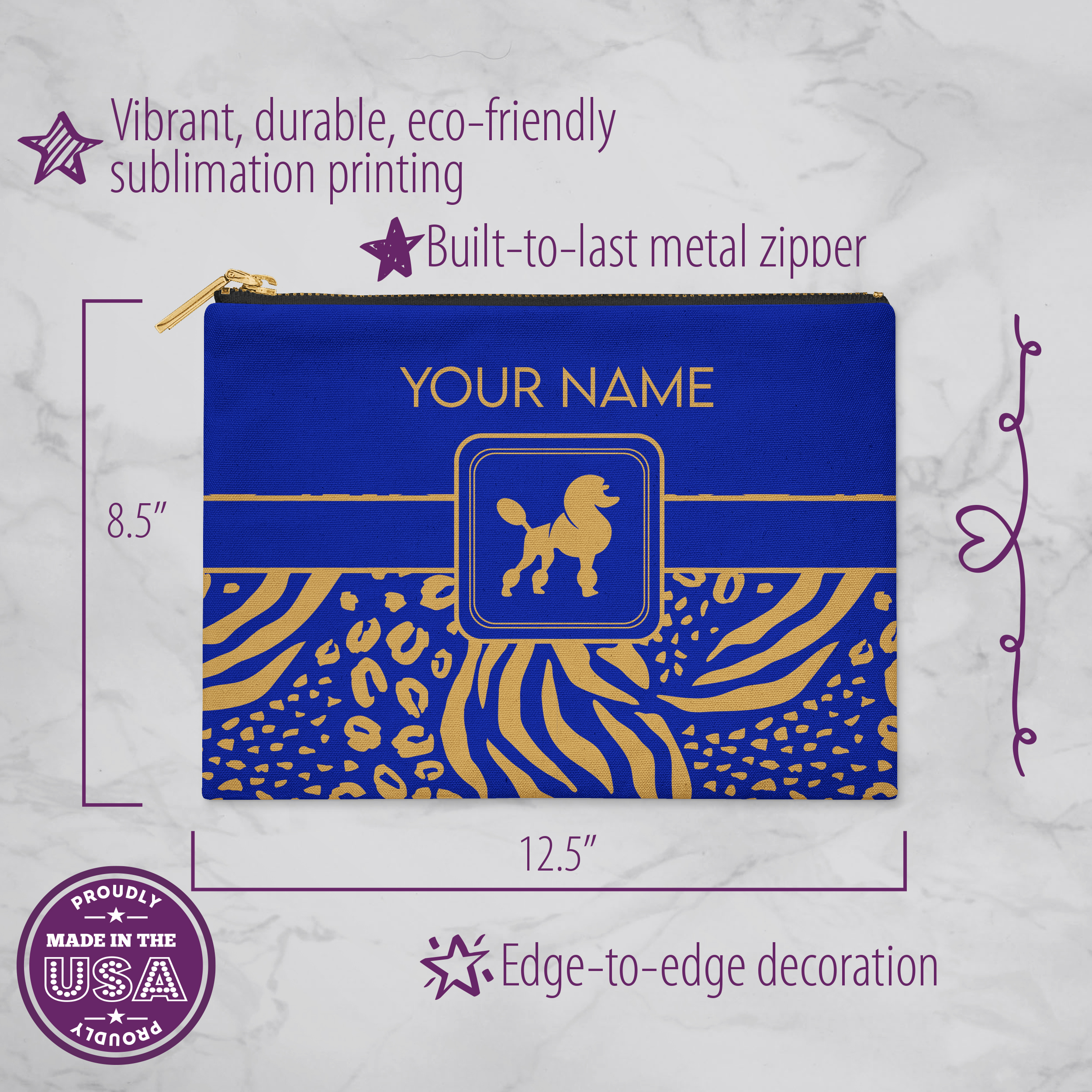 DURABLE: Decorated with permanent, eco-friendly fabric printing, permanently dyed into the fibers, that will not fade, crack or bleed and lasts permanently, even with repeated use and cleanings, withstanding the normal wear and tear of a makeup pouch.
