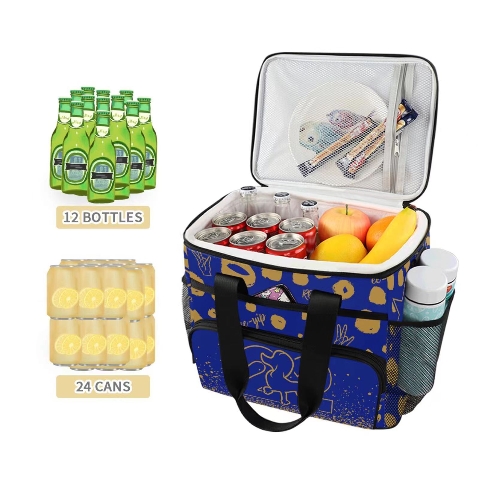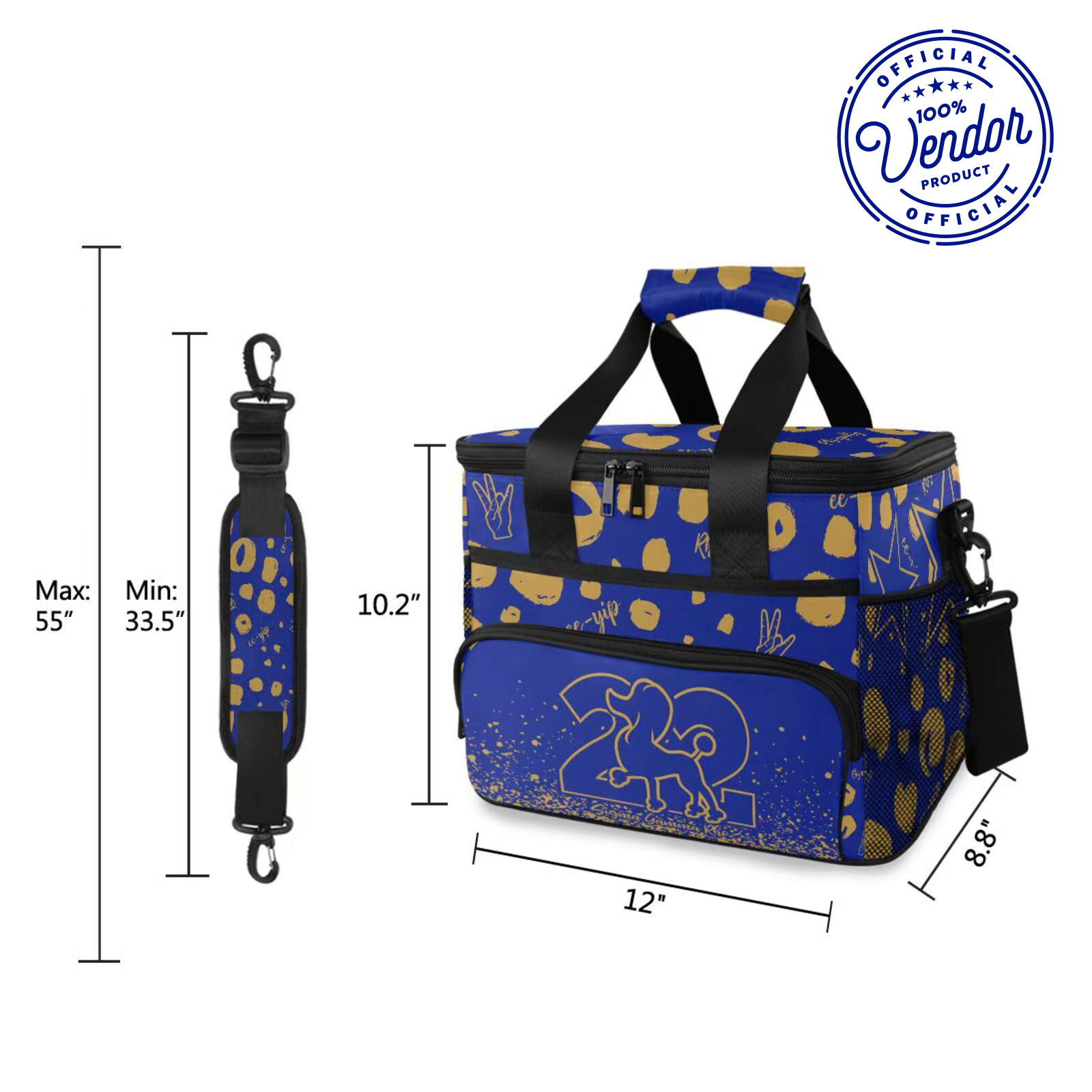 MATERIAL: Made with Polyester and PEVA. It has one main large zipper pocket, two mesh pockets on both sides and a pocket in the front of the bag. With a reinforced handle and a adjustable shoulder strap for you to carry it easily. It can keep cold for 12 hours.