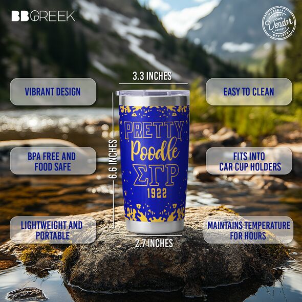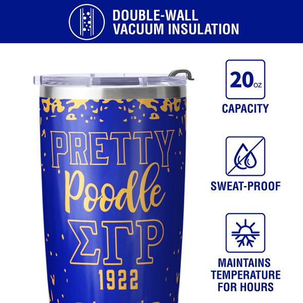 This 20 oz stainless steel tumbler is designed for Sigma Gamma Rho Sorority members, featuring the elegant “Poodle” design. Constructed with high-quality materials, it combines style, functionality, and durability. The tumbler’s double-wall vacuum insulation ensures your beverages remain hot or cold for hours, making it suitable for daily use or on-the-go hydration needs.