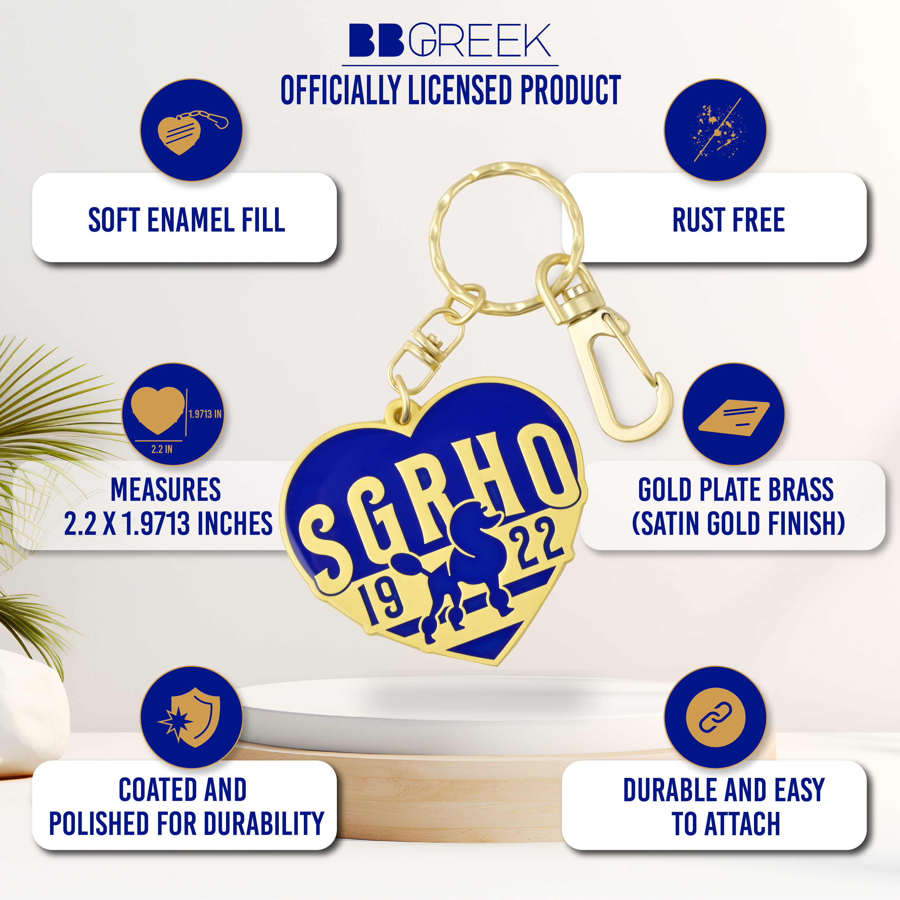 Crafted from plated brass with a soft enamel surface, this Sigma Gamma Rho keychain is designed to last. The engraved 1922 mark and heart shape add a personal touch, while the sandblasted back and 2.5mm thickness offer a premium, solid feel in hand. Sized at 2.2 inches wide by 1.9 inches high, it is both compact and noticeable. The attached keyring ensures easy connection to keys, bags, or lanyards.
