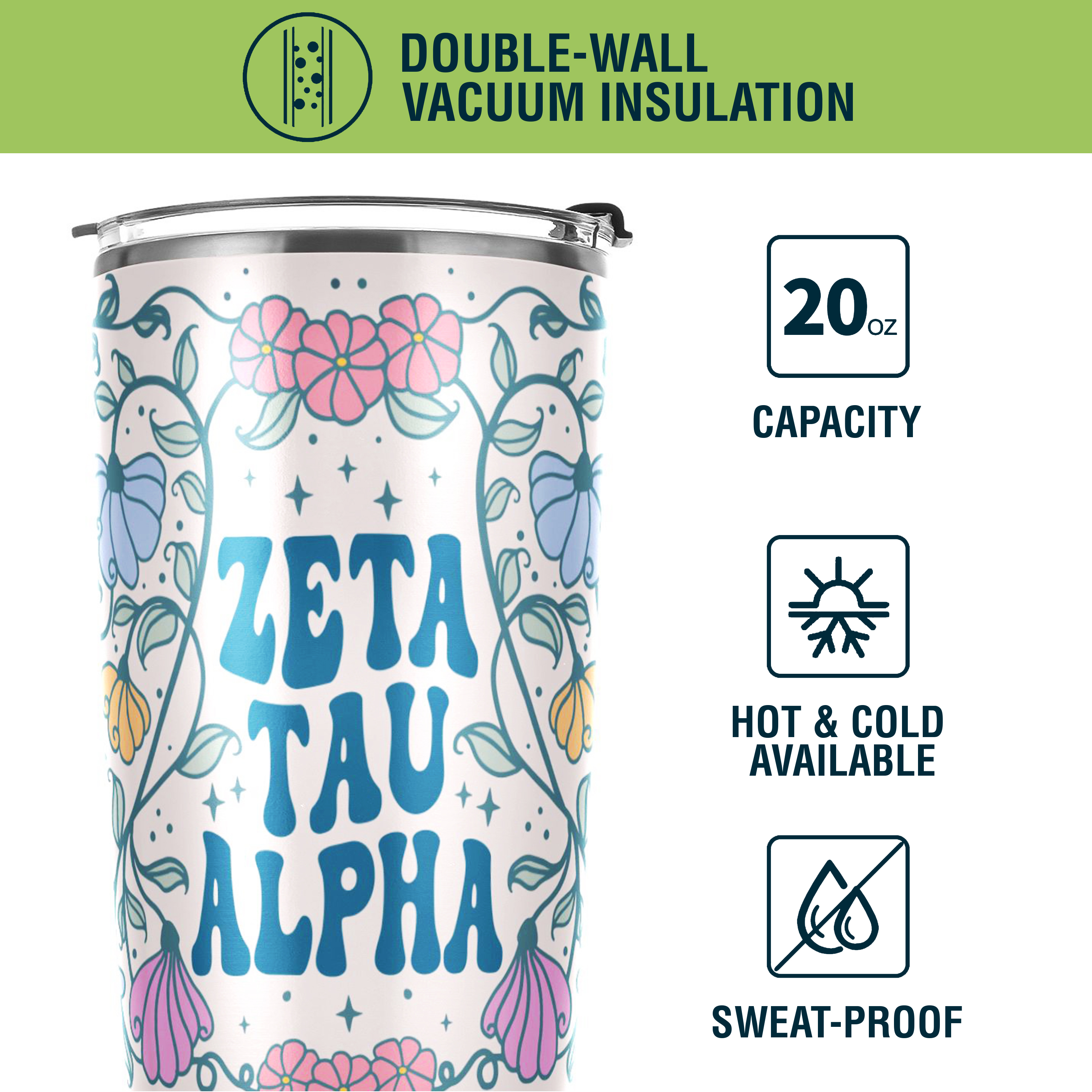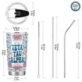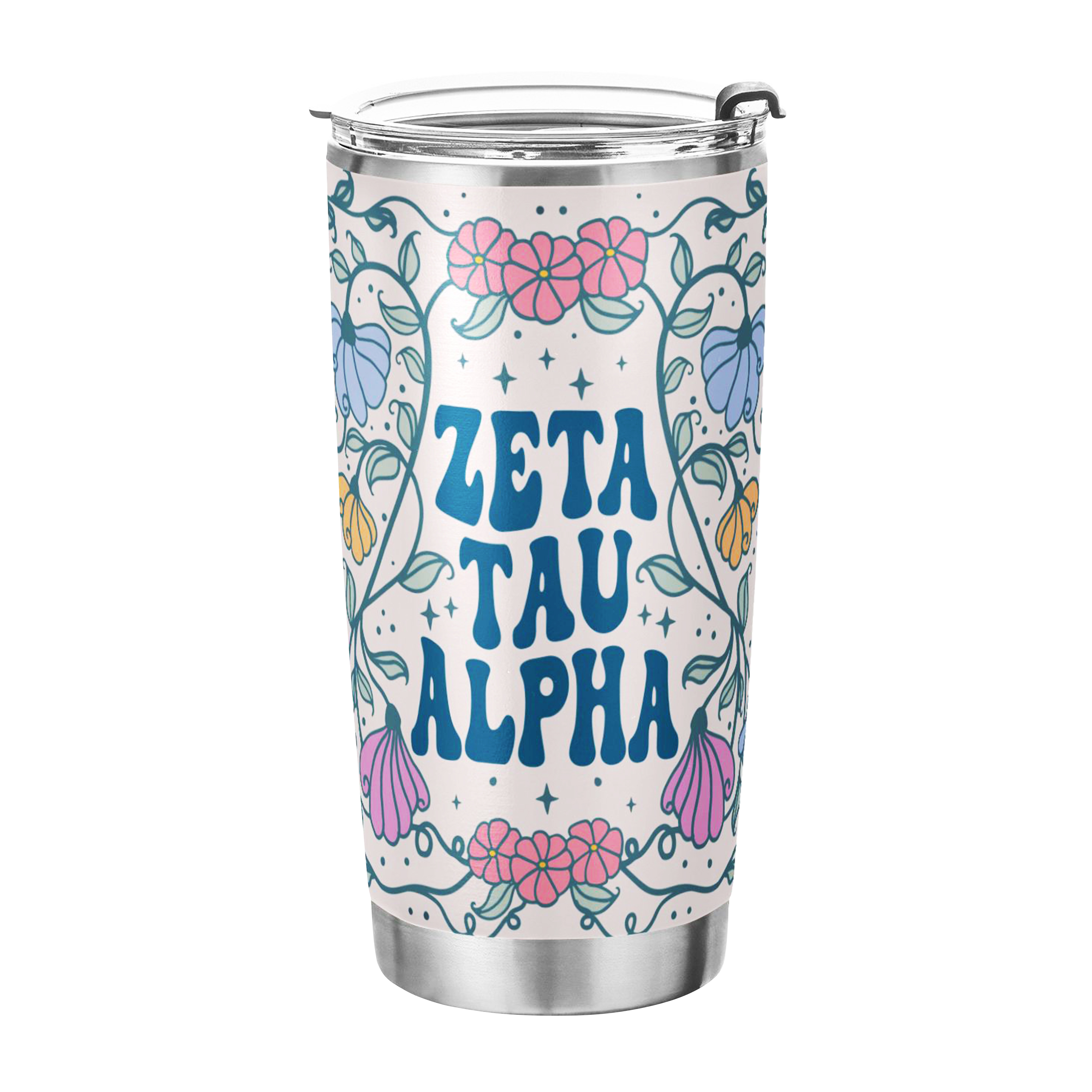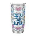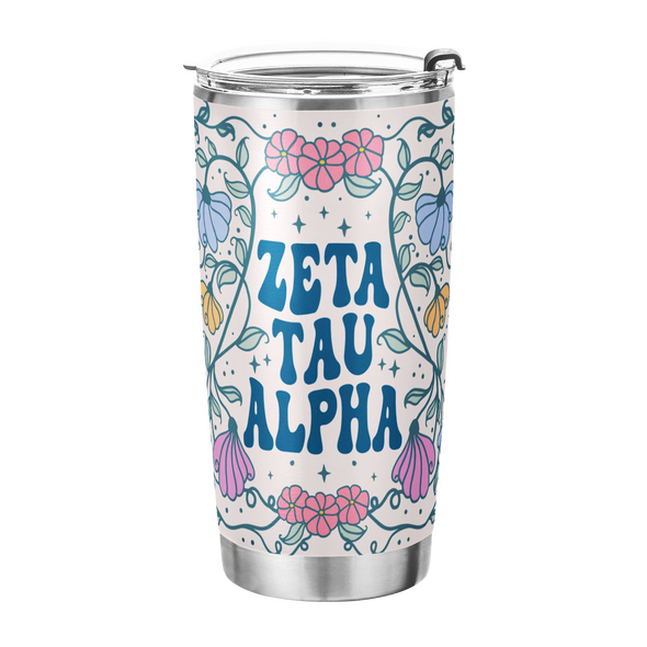 ZETA TAU ALPHA TUMBLER: This 20 oz stainless steel tumbler features the elegant "Flowers" design, reflecting the values of Zeta Tau Alpha Fraternity. Its vibrant and stylish design adds charm and practicality to daily hydration routines.