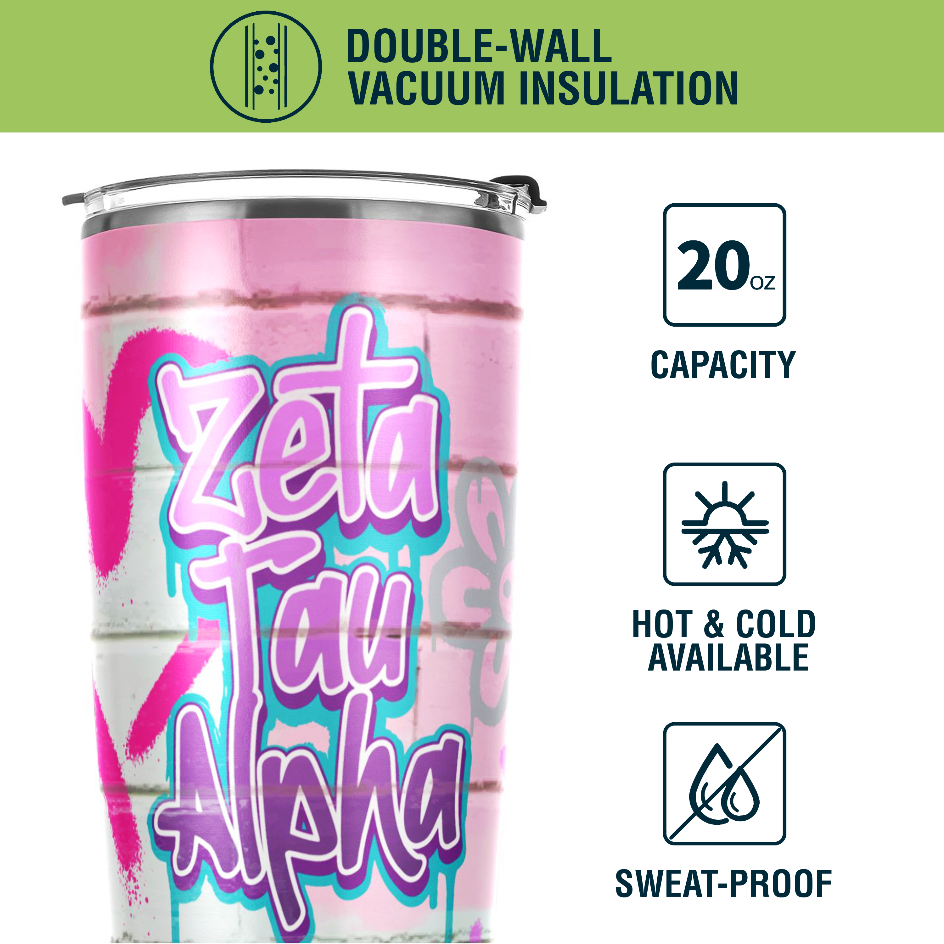 ZETA TAU ALPHA TUMBLER: This 20 oz stainless steel tumbler features the elegant "Graffiti" design, reflecting the values of Zeta Tau Alpha Fraternity. Its vibrant and stylish design adds charm and practicality to daily hydration routines.