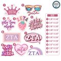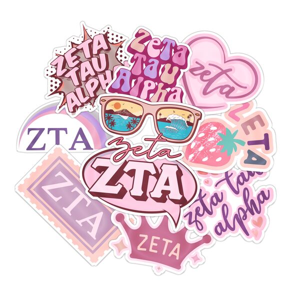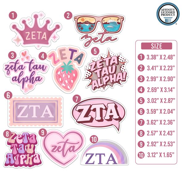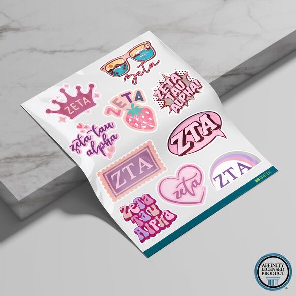 SET OF 10 STICKERS: This pack includes 10 Zeta Tau Alpha stickers arranged on an 8.5 x 11-inch sheet, offering a variety of designs to suit different applications while maintaining a compact size.